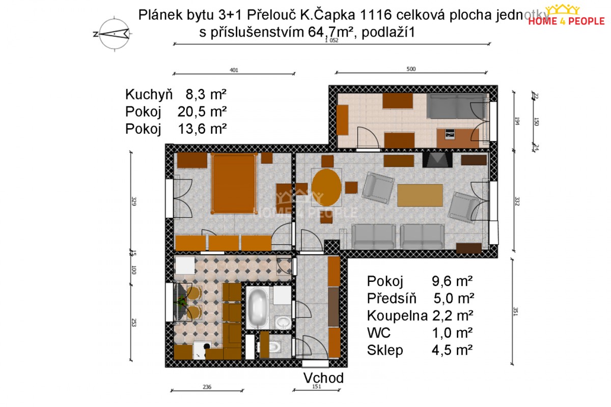 ke koupi byt 3+1 (64, 7m²), umístěný v 1. NP (první nadzemní patro) cihlového domu o čtyřech NP. Dům prošel v roce 2020 celkovou rekonstrukci, včetně zateplení pláště budovy, zatep...lení střechy, nová plastová okna, nové vchodové dveře včetně schránek. Dále došlo k výměně vodovodního a odpadního potrubí a elektroinstalace ve společných prostorách domu. Příjemné je oplocení pozemku domu, s výsadbou stromů a zeleně, které lze využívat společně s ostatními obyvateli domu. Do bytu je zaveden plyn, ohřev teplé vody zajišťuje plynová karma v byte, sporák v kuchyni je též plynový. Vytápění je centrální plynovou kotelnou, umístěnou v suterénu domu. Dům je bez výtahu a byt ve zvýšeném 1. NP (první nadzemní patro) je výhodný pro snadný přístup. Okna jsou v dostatečné výšce, aby do bytu z ulice nebylo vidět. Byt je v původním udržovaném stavu a nabízí tedy skvělou příležitost pro modernizaci, dle vlastních představ. Zařízení současným nábytkem bude včas vystěhováno. K bytu náleží zděný sklep 4, 5 m² s menším oknem. Křemenské Předměstí Přelouče, působí velice moderně a příjemně. V blízkosti je zastávka MHD, školy, školky, dětská hřiště a obchody. Město poskytuje veškerou občanskou vybavenost, dobrou dopravní dostupnost díky napojení na silnici I/2 a blízkost k dálnici D35, což zajišťuje snadné spojení s okolními městy Pardubice 18 km, Hradec Králové 35 km, Praha 104 km. Veškerá doprava je zajištěna vlaky na místní stanici a řadou autobusových linek. Náš specializovaný tým vám zajistí dle vašich možností a požadavků financování k pořízení tohoto bytu. V případě vašeho zájmu o prohlídku mě kontaktujte kdykoli. Ev. číslo: 31980. Energetický štítek: E