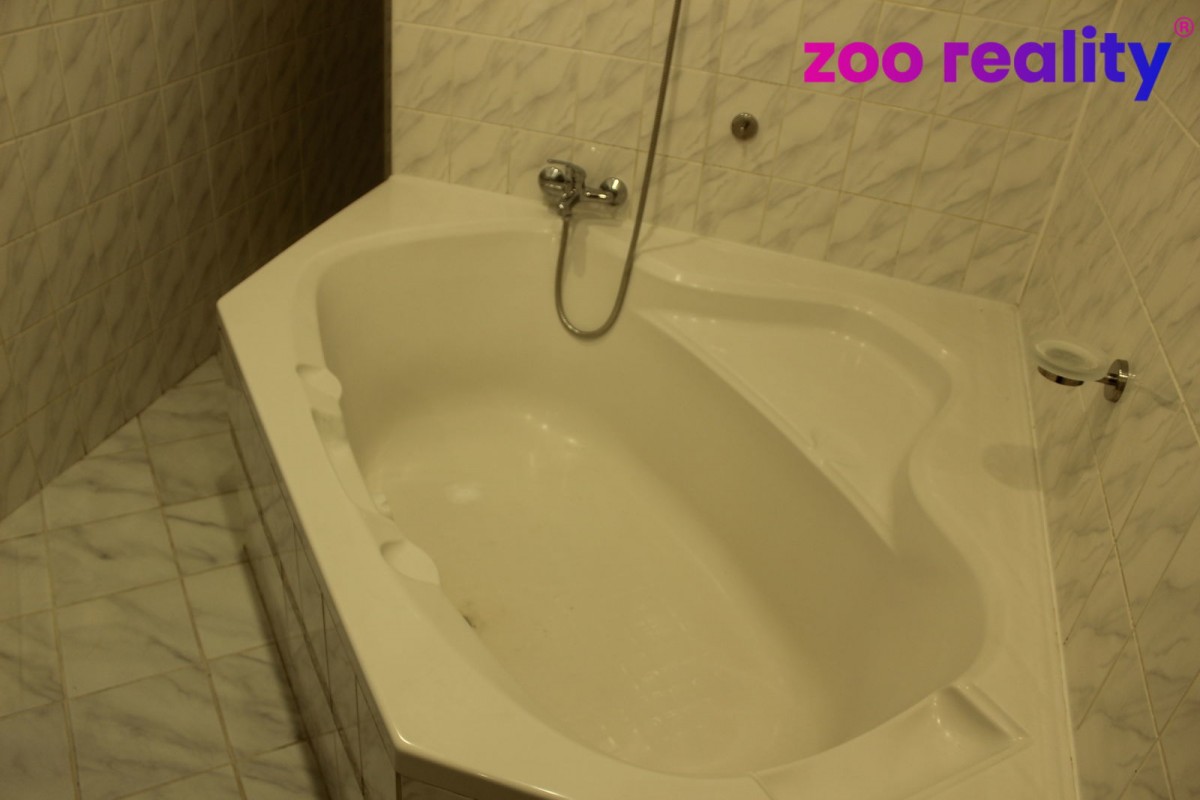 Z chodby se dále vstupuje do koupelny. Zde je rohová vana, toaletka s umyvadlem a za příčkou je oddělené sociální zařízení. V koupelně je také místo pro pračku a sušičku. Koupelna má zděné jádro.