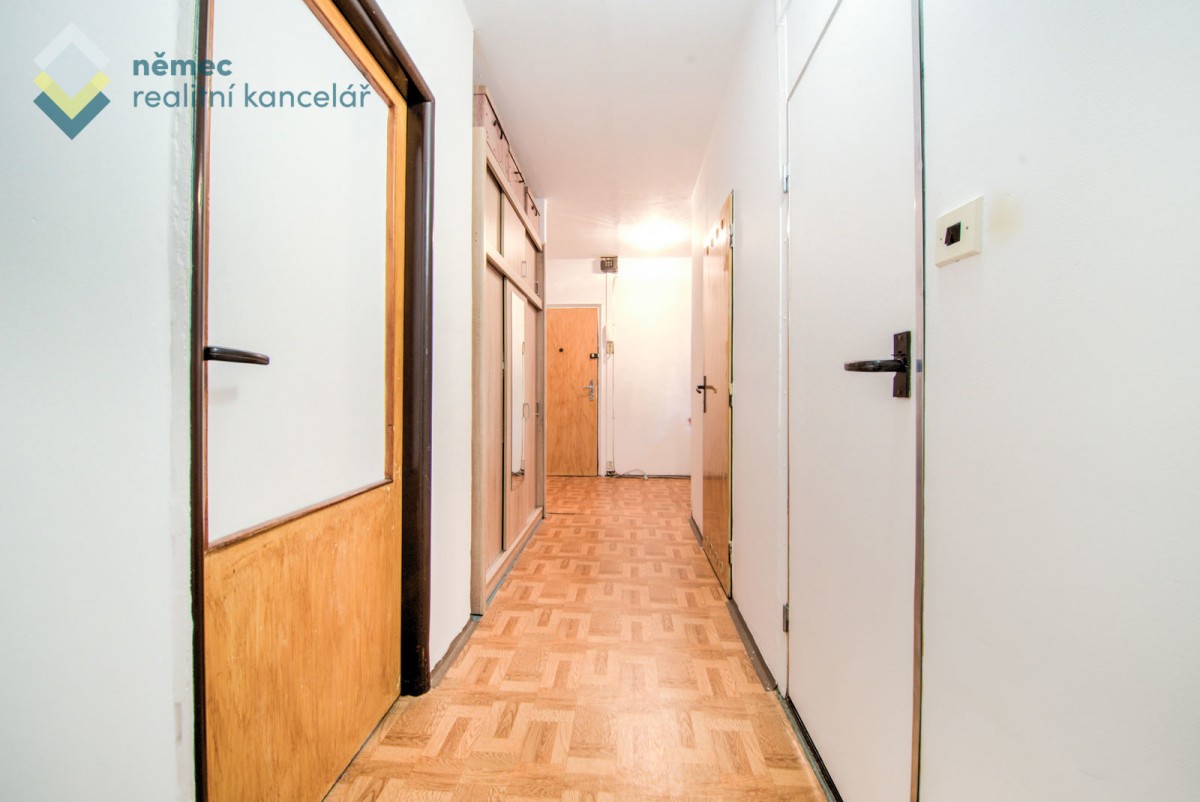 Z předsíně (9, 37 m²), v níž je dostatek místa pro šatní skříně, je vstup do koupelny (2, 60 m²) s vanou a pračkou, na samostatné sociální zařízení WC (1 m²) a do dvou samostatných neprůchozích pokojů (11, 37 a 10, 81 m²). Ty mají oba hezký výhled na okolní stromy a jsou orientované na sever.