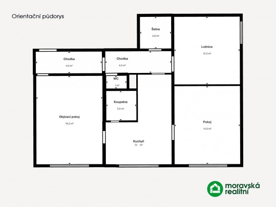 - tři obytné místnosti 16, 2m2, 14, 3m2 a 12, 3m2