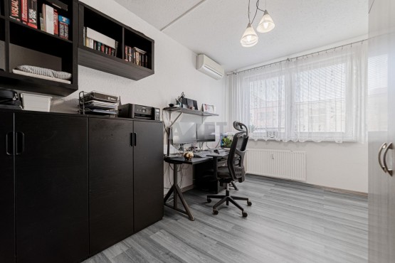 Umístění bytu je v 5. nadzemním podlaží (4. patro) z osmi. Vstup do bytu je zabezpečen bezpečnostními dveřmi značky SHERLOCK. Jednotlivé místnosti jsou neprůchozí, vyjma obývacího pokoje. Kuchyňská linka je rohová s vestavnými spotřebiči kompletně na míru dělaná potřebám a požadavkům majitele s použitím nadstandardních materiálů. Lednice je zabudovaná do konceptu kuchyňské linky a taktéž je součástí prodeje. Ložnice navazující na zasklenou lodžii je dostatečně velká nejen pro manželkou postel, ale také pro šatní skříň. Útulný dětský pokoj nyní sloužící jako pracovna do které je vstup přes malou chodu s vestavěnými skříněmi poskytující velký úložný prostor. Koupelna, která je díky promyšlené rekonstrukci nadstandardně velká pro umístění pračky se sušičkou a klasické vany se sprchovou zástěnou. Toto praktické řešení vany jistě ocení každý rodič jehož dítko miluje hraní si ve vaně bez rizika vyplavení bytu. sociální zařízení WC je samostatné. Jistě je velkým benefitem klimatizace v obývacím pokoji, ložnici a pracovně. K bytu náleží standardní sklepní kóje. Nynější měsíční předpis plateb za byt činí 5. 129 Kč.