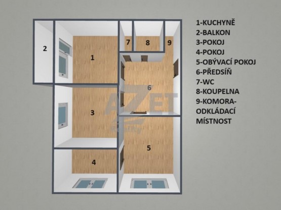 - okna kuchyně a jednoho z pokojů orientována na sever, okna druhého pokoje a obývacího pokoje orientována na západ
