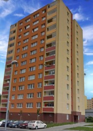 Byt je umístěný v 11. patře panelového domu po revitalizaci.