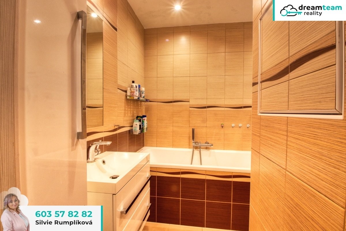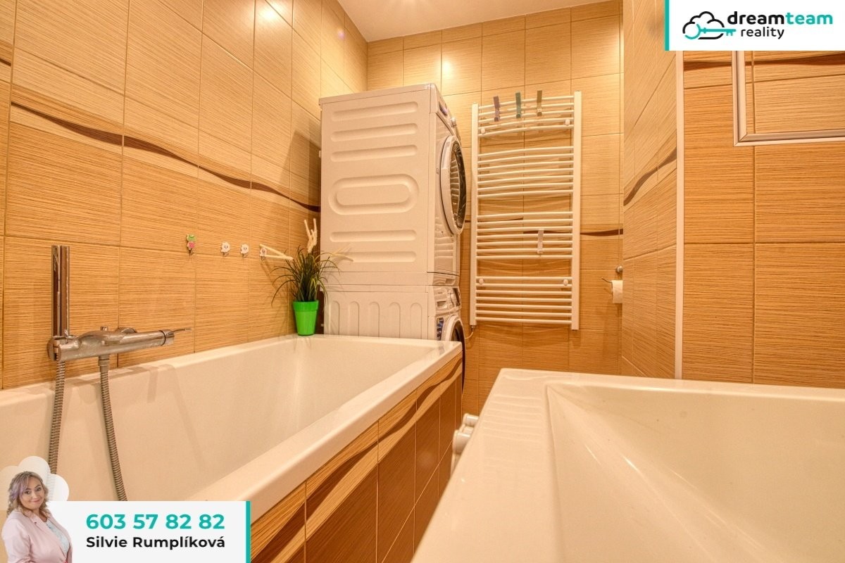 V rámci rekonstrukce byla v bytě moc šikovně změněna dospozice. Díky tomu je jádro zděné a koupelna je větší než obvykle. Je tady dost místa na plnohodnotnou vanu, vedle níž vejde i pračka se sušičkou a za rohem je i toaleta.