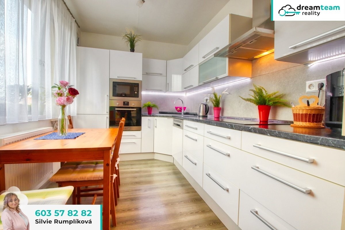 Podívejte se ve fotkách na krásnou prostornou kuchyni ve tvaru L s obrovským množstvím úložných prostor a spoustou denního světla. Nejuniverzálnější barevnou kombinaci bílé, šedé a černého mramoru krásně doladíte s každou barvou. K tomu přidejte, že všechny spotřebiče jsou vestavěné: lednice s mrazákem, mikrovlnka, trouba, myčka a sklokeramická deska, vše od Whirlpoolu. Jako bonus v kuchyni je jídelní stůl, aby se nedrobilo v obýváku a mohli jste si ke škrábání brambor sednout.