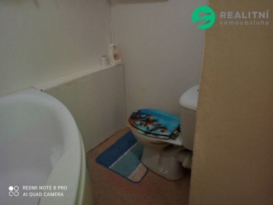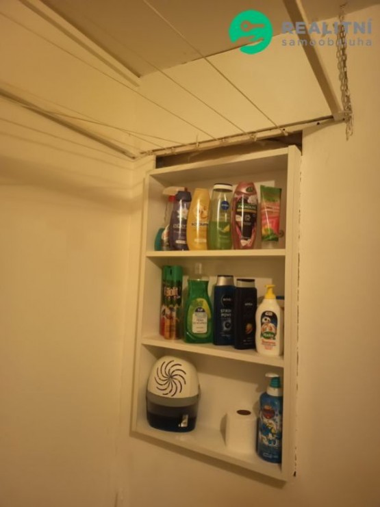 Koupelna: sociální zařízení WC kombi, rohová vana, umyvadlo se skříňkou, zrcadlová skříňka, police na míru