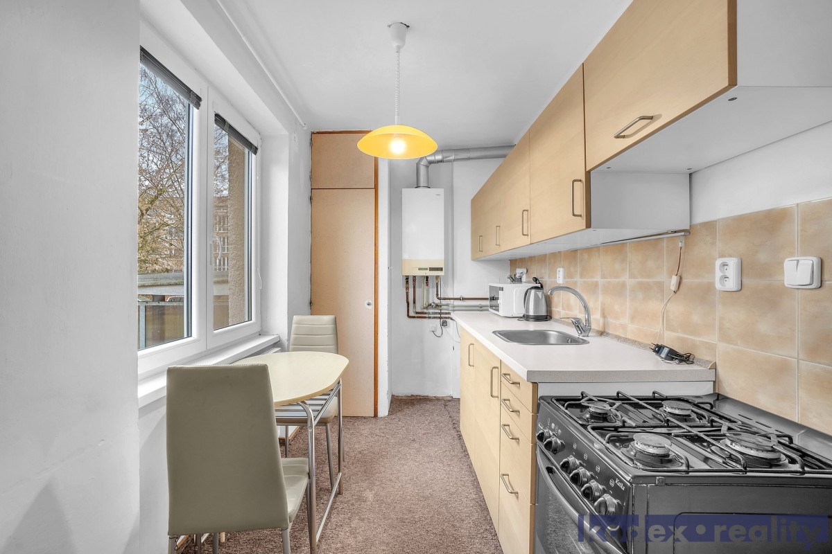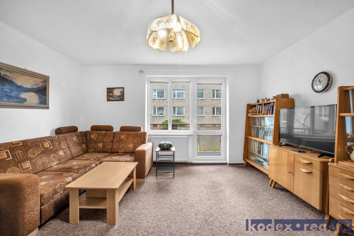 Dispozice bytu: vstupní chodba s úložným prostorem, koupelna se sprchovým koutem a topným žebříkem, sociální zařízení WC, kuchyň s místem na lokální plynový kotel, obývací pokoj se vstupem na balkon, dětský pokoj, ložnice, sklep v suterénu budovy.