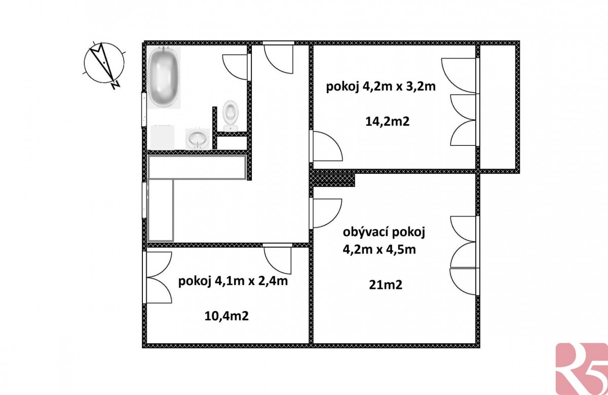 Obývací pokoj má 21m2, ložnice kde je vstup na balkon 2, 6m2 má 14, 2m2 a pokoj má rozlohu 10, 4m2.