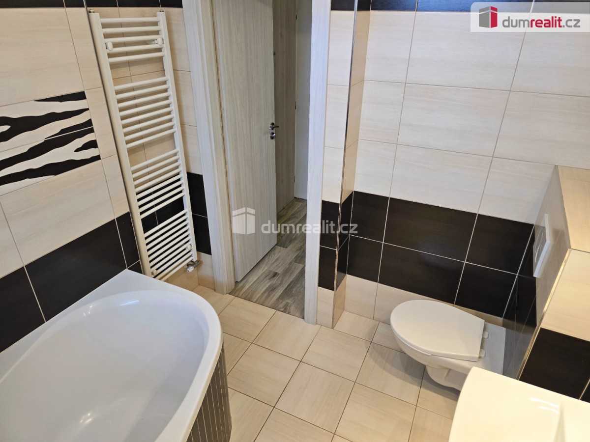 Dispozice bytu: vstupní chodba, koupelna s rohovou vanou a sociální zařízení WC, kuchyň, ložnice s balkónem, obývací pokoj s krbovými kamny a dětský pokoj.