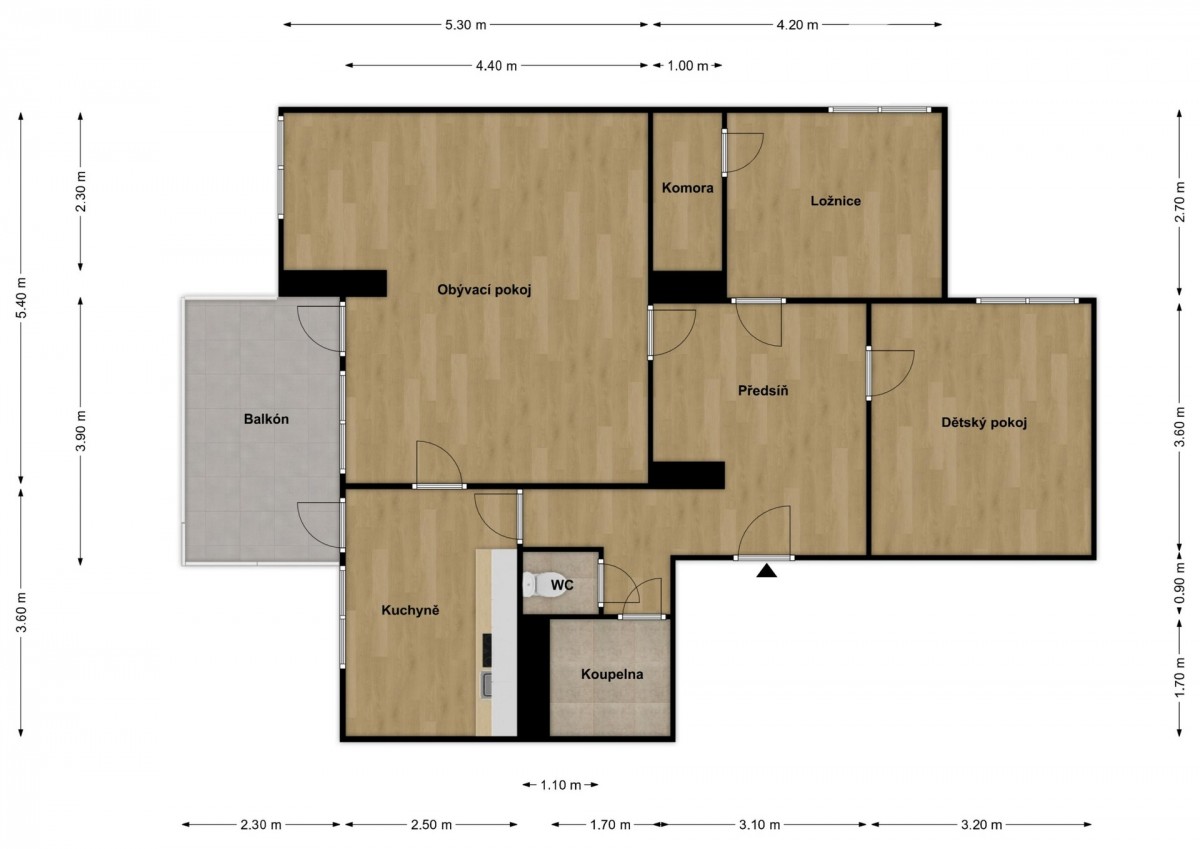 Součástí bytu je balkon 9 m² a sklep 4 m², takže celková plocha k užívání činí cca 94 m².