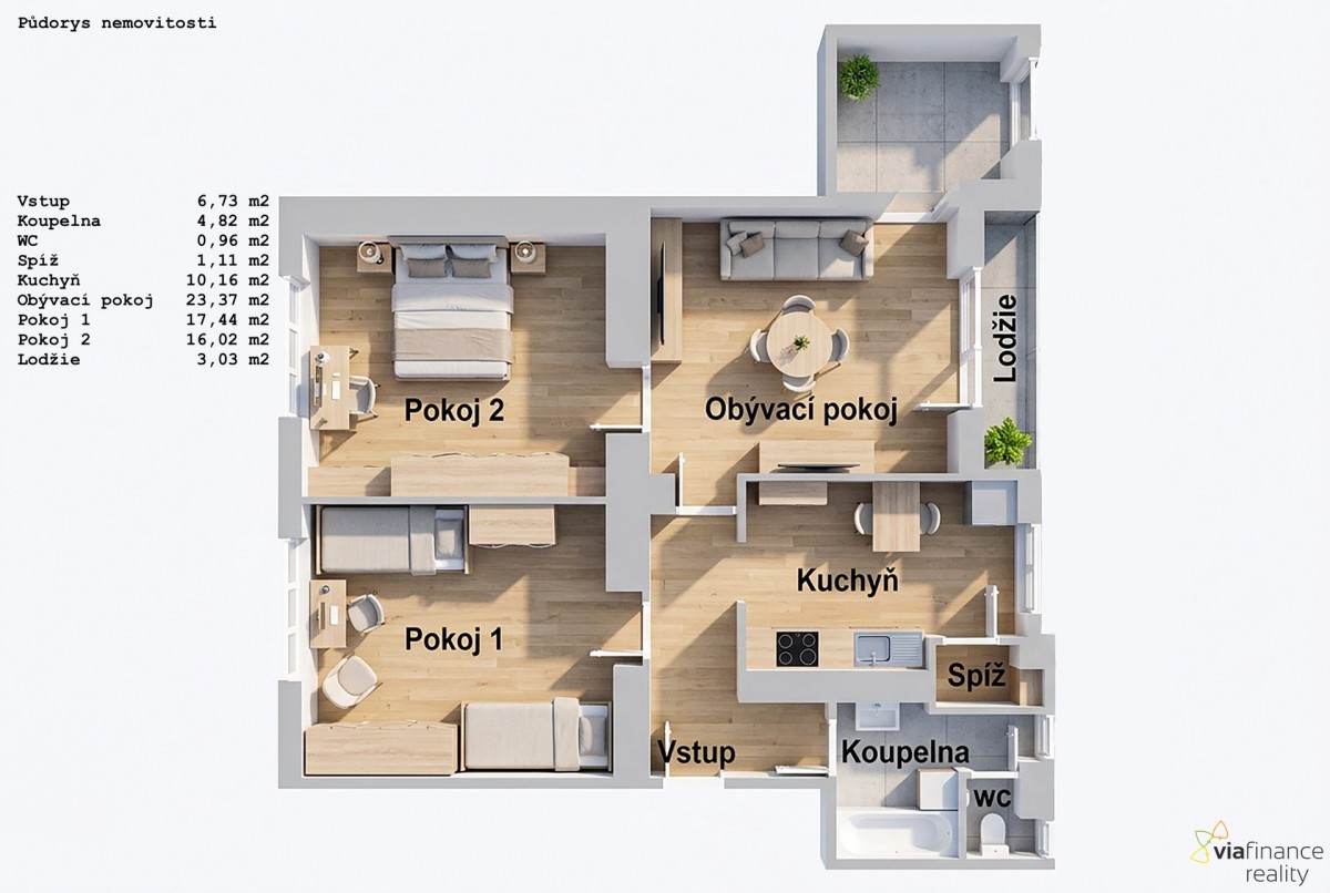 Součástí bytu je lodžie o délce cca 3 m. K bytu náleží také dva sklepy o celkové ploše 6, 65 m² (5, 00 m² a 1, 65 m²), které poskytují praktický úložný prostor.
