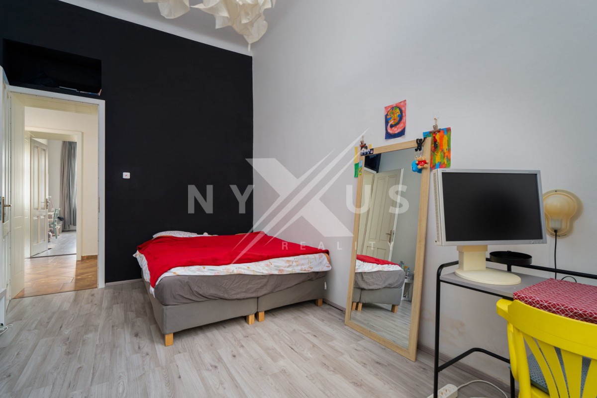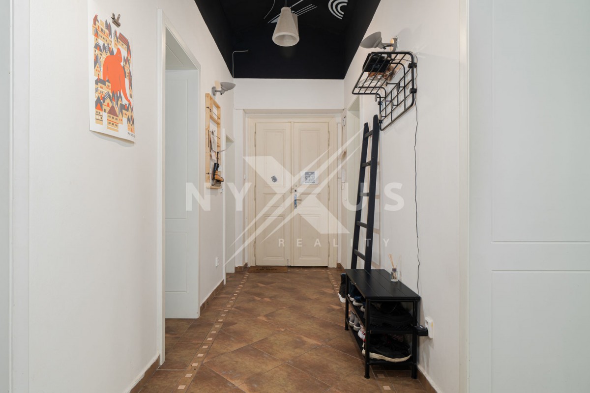 Interiér bytu nabízí prostornou vstupní halu ( 9, 05 m2), kuchyni s jídelnou ( 15, 33 m2), třemi samostatnými neprůchozími pokoji ( 15, 31 m2 , 19, 82 m2, 21, 26 m2), z nichž jeden pokoj má orientaci oken do vnitrobloku a dva pokoje orientaci oken do klidné ulice, koupelnu se sprchovým koutem ( 2, 78 m2) a místem pro umístění pračky, samostatnou toaletu ( 1, 19 m2) a sklep ( 3 m2).