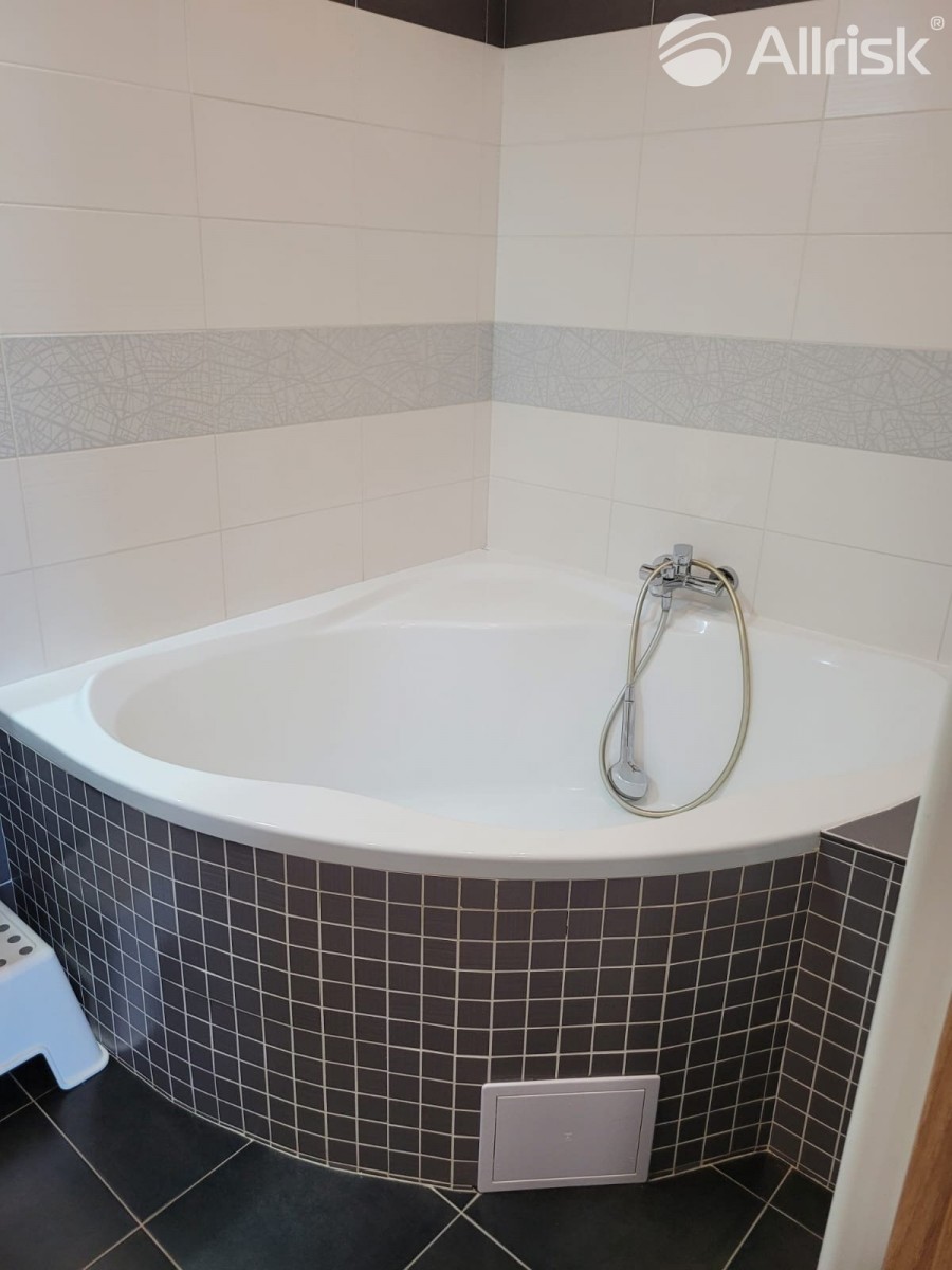 Prostorná koupelna s rohovou vanou, zděné jádro.