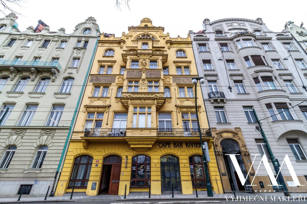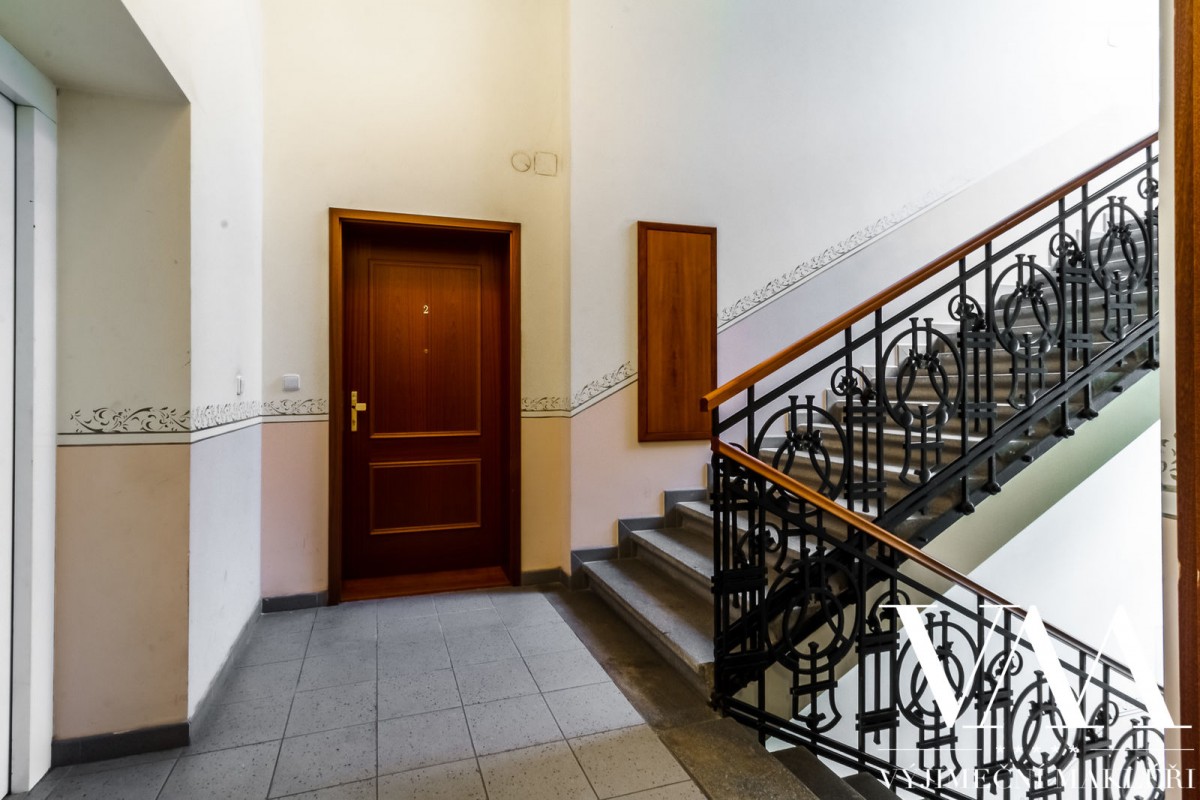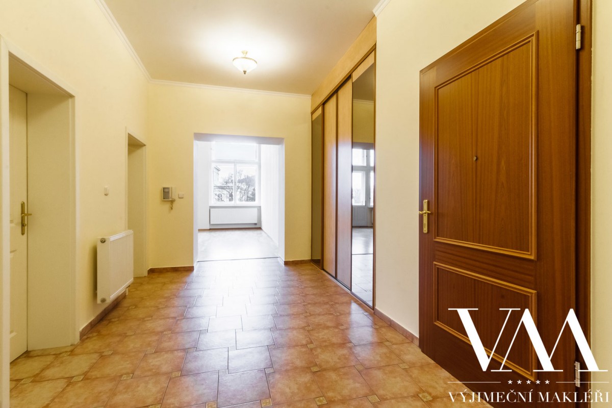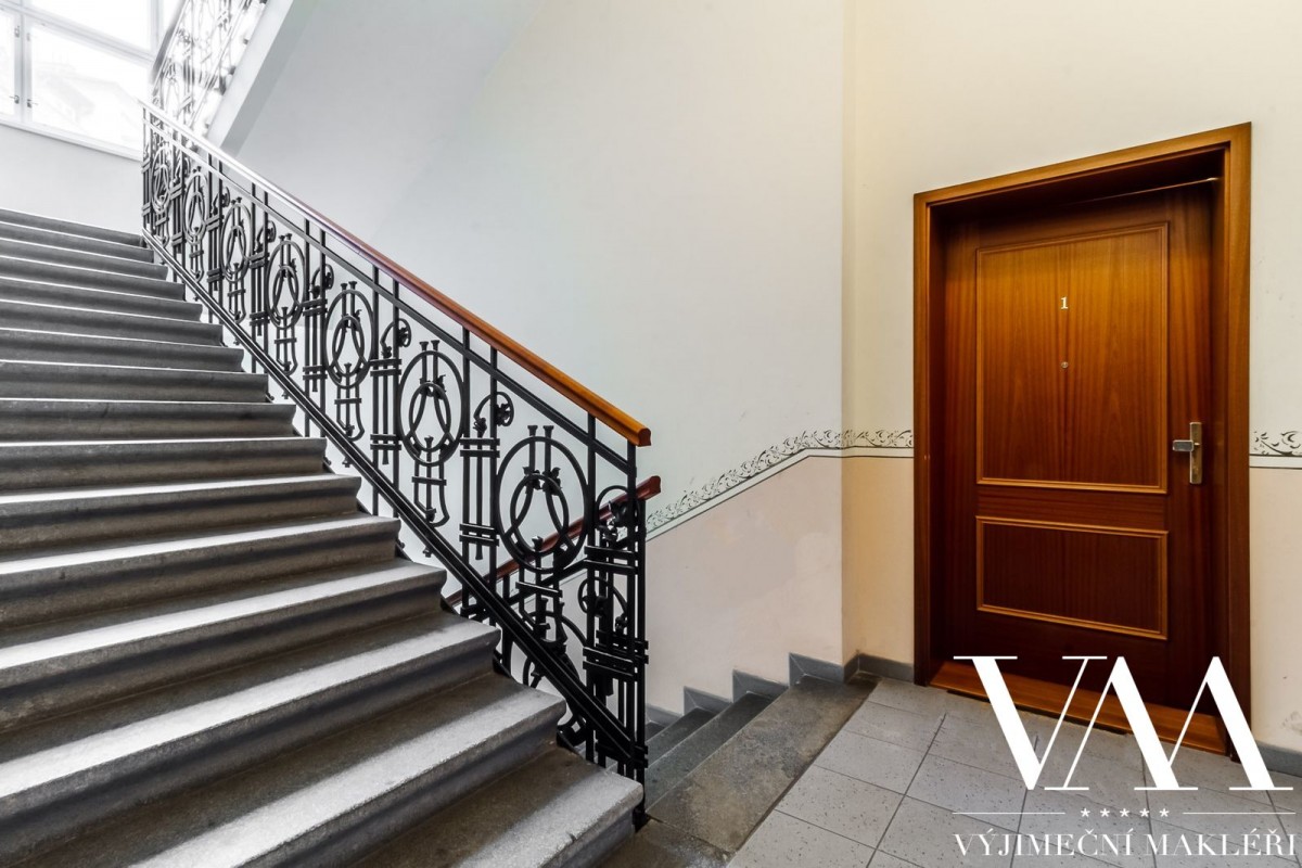 Byt se nachází v 1. patře cihlového domu včetně výtahu, z celkového počtu 5ti pater. Prvorepublikový, secesní dům prošel v roce 2005 kompletní a kvalitní rekonstrukcí (zrestaurovaná fasáda, nové stoupačky (vertikální svody), el. rozvody, nový moderní výtah, vstupní dveře na čip). Byt disponuje velkou prostornou chodbou, dvěma oddělenými pokoji, které mají výhled do klidného vnitrobloku, světlým obývacím pokojem se vstupem na balkón s možností posezení a úžasným, uklidňujícím výhledem na panorama Prahy, dále dvěma oddělenými pokoji, které mají výhled do klidného vnitrobloku. Z předsíně je vstup i do prostorné samostatné koupelny a sociální zařízení WC. Stropy jsou vysoké 4, 5 m. Interiér lze přetvořit na velice luxusní, elegantní a reprezentativní prostor s důrazem na design, který splňuje nejvyšší nároky na komfortní a kvalitní bydlení.