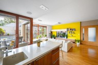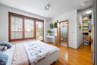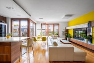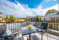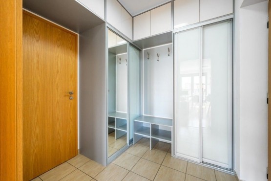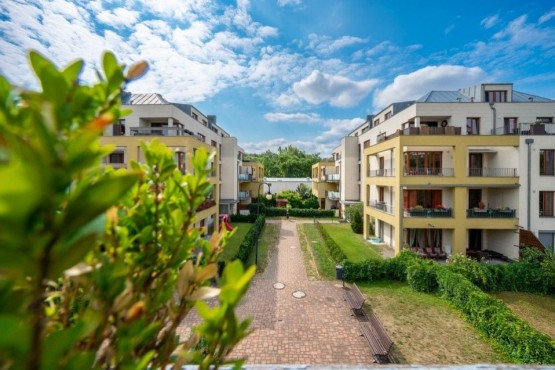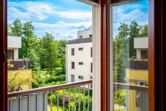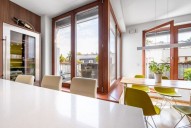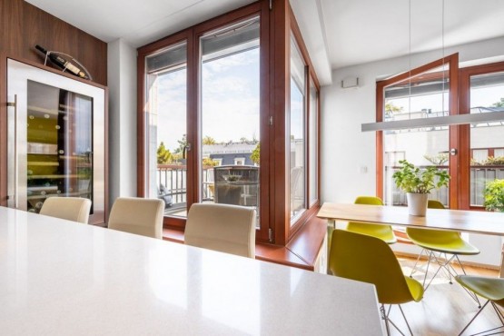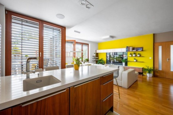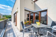 Dispozice jednotky 3kk nabízí prosluněný otevřený koncept obývacího pokoje s kuchyní s ostrůvkem, jídelnou a přímým vstupem na terasu obklopující celou jednotku s posezením, 2 ložnice, 2 koupelny, samostatnou toaletu a vstupní chodbu. Dostatek denního světla a slunce zajišťují velkoformátová dřevěná eurookna po celém obvodě bytu.