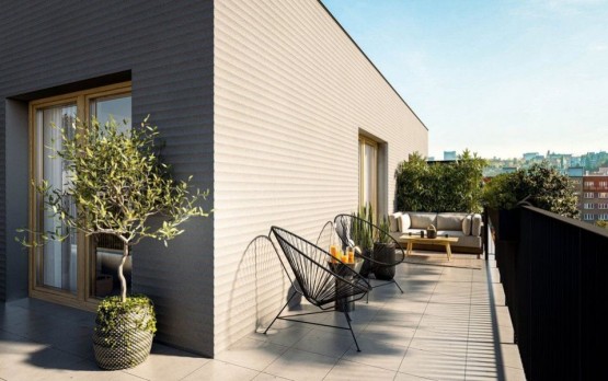 Celková plocha bytu je 109m. Přístupná střecha poskytuje dal...ší prostor jako vyhlídkovou terasu a místo k odpočinku. Byty standardu Fit Out jsou dokončeny do finálních povrchů včetně sanitačních zařízení. Nevtíravý design zdůrazňuje čistotu stylu. Skromný vzhled je doprovázen fenomenální funkcionalitou a praktičností. Velikost budovy poskytuje dostatek soukromí a zároveň možnosti budovat sousedské vztahy. Moderní bytový dům je citlivě zapojen do blokové zástavby v oblíbené čtvrti Nusle.