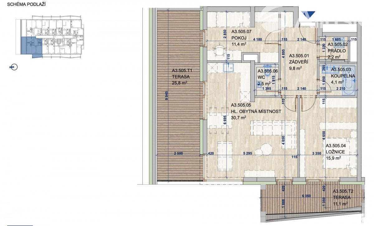 Velkým benefitem bytu jsou dvě prostorné terasy přístupné z obytné místnosti, pokoje i ložnice.