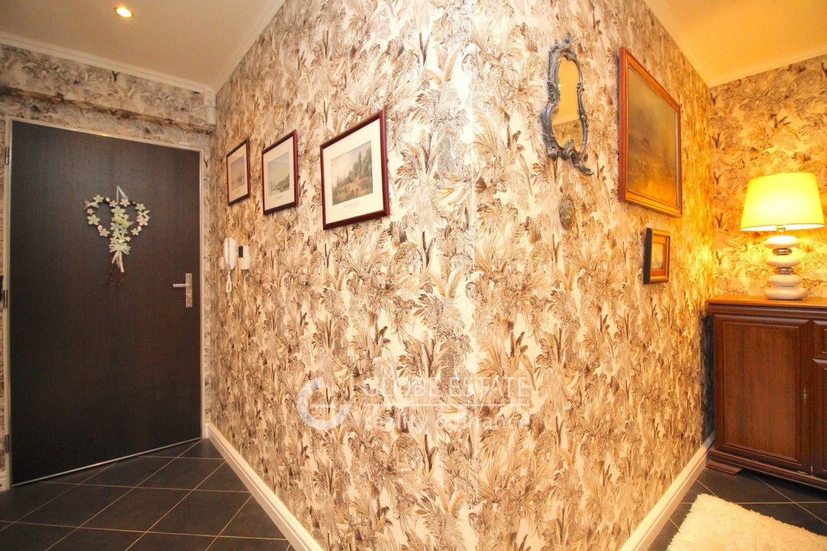 Chodba a pokoje jsou zdobeny luxusními stylovými tapetami, přičemž vzor jedné z tapet se elegantně propisuje na vestavěnou skříň v ložnici, která byla rovněž vyrobena na zakázku.