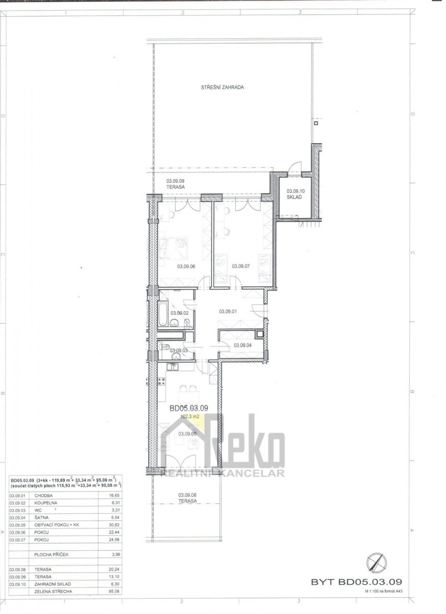 Zprostředkujeme prodej bytu o dispozici 3+kk s výměrou 115, 93 m2, dvěma terasami a střešní zahradou s celkovou výměrou 128, 42 m2 v žádané lokalitě v Bero...uně "Na Máchovně", s jehož výstavbou se započalo v září 2023 a bude dokončeno v prosinci 2025. V bytě, umístěném v 3. NP (třetí nadzemní patro) bytového domu je obývací pokoj s kuchyňským koutem, dva samostatné pokoje, šatna, chodba, samostatné sociální zařízení WC a koupelna. V koupelně umyvadlo, akrylátová vana, sociální zařízení WC a otopný žebřík, na podlaze dlažba. Okna plastová, laminátové plovoucí podlahy. U jedné terasy se nachází zahradní skládek. K bytu náleží sklepní kóje a garážové parkovací stání. Dům je bezbariérový včetně výtahu.
