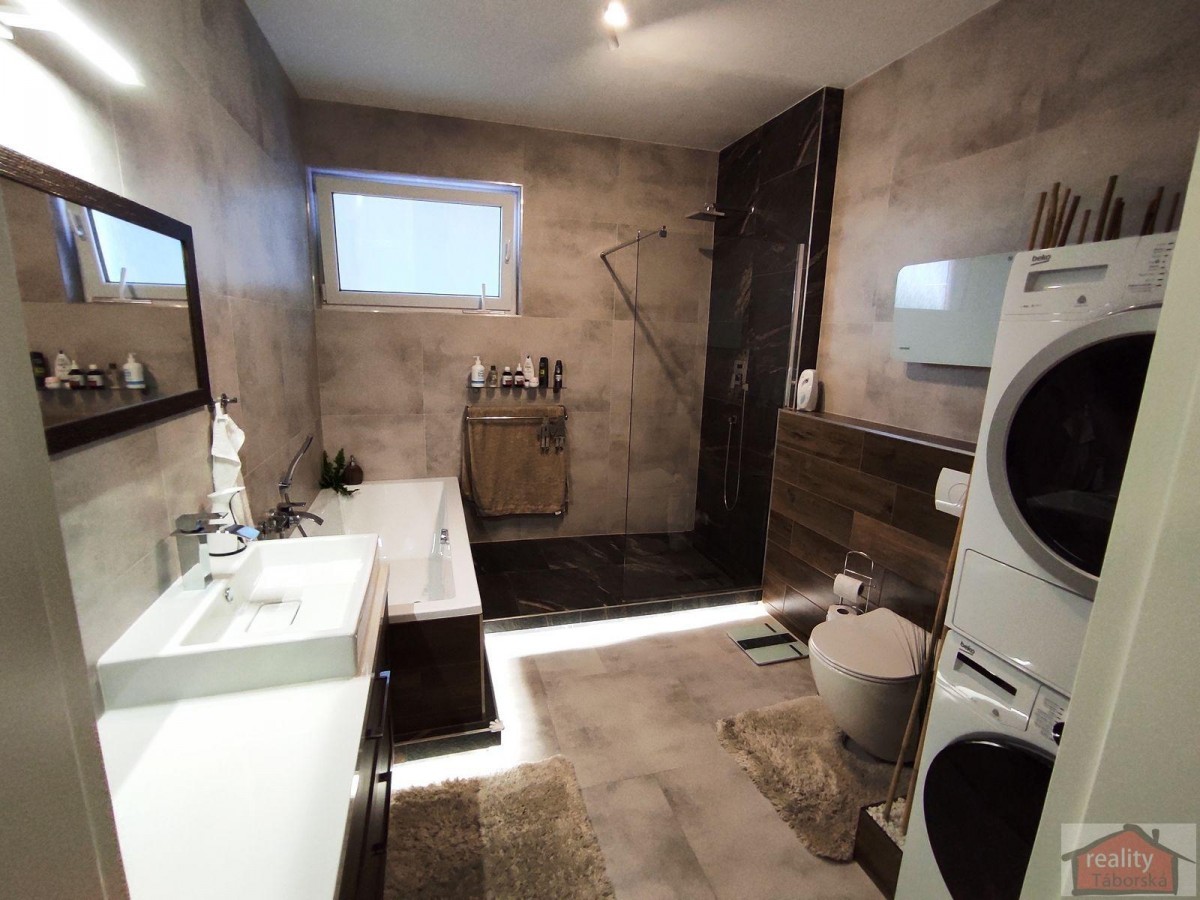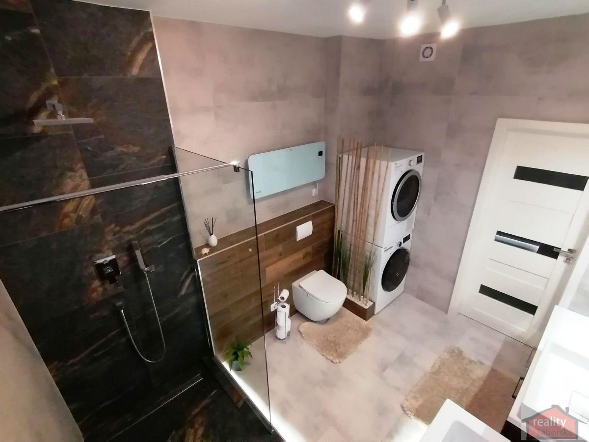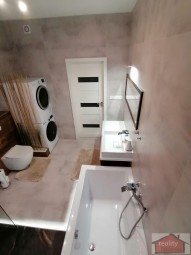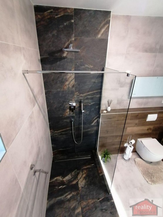V koupelně (8, 40 m2) je vana, sprchový kout, dvojumyvadlo a toaleta.