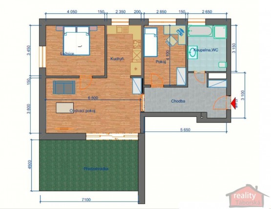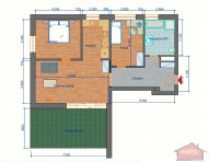 Celková plocha bytu je 85 m2 + zahrádka 32 m2. Celkem 117 m2.