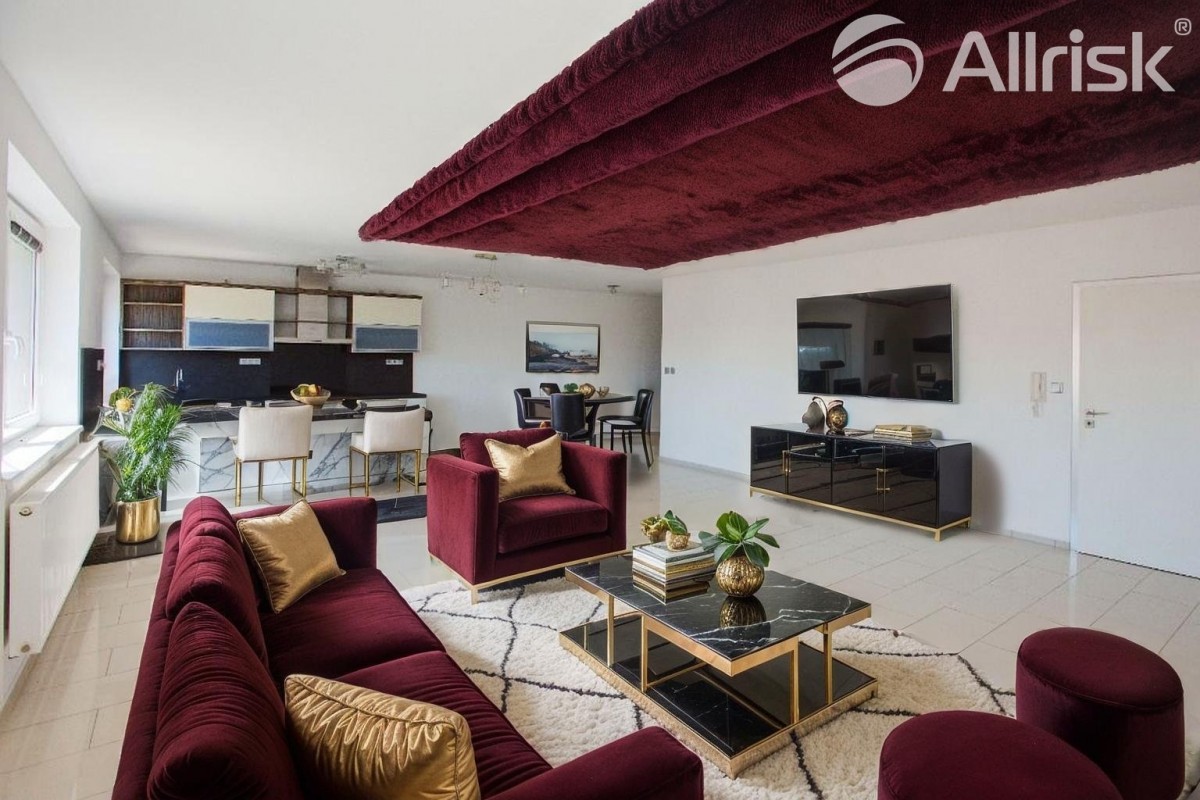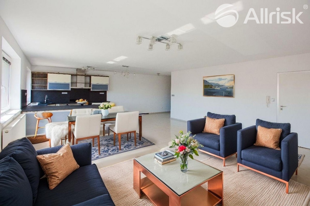 Dominantou bytu je otevřený obývací prostor propojený s kuchyní – ideální pro rodinný život i setkávání s přáteli. Velká okna zajišťují dostatek přirozeného světla po celý den.