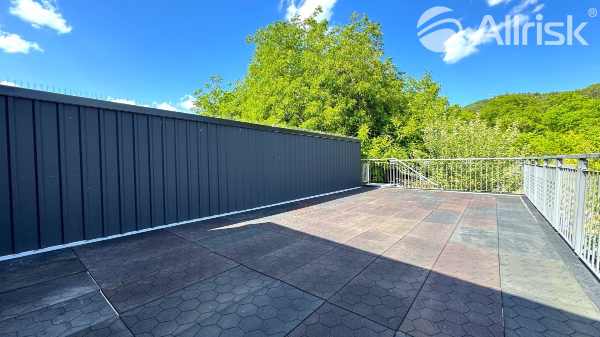 Velká terasa (46 m²) poskytuje perfektní místo pro ranní kávu, letní grilování, vířivku nebo bezpečný prostor pro dětské hry.