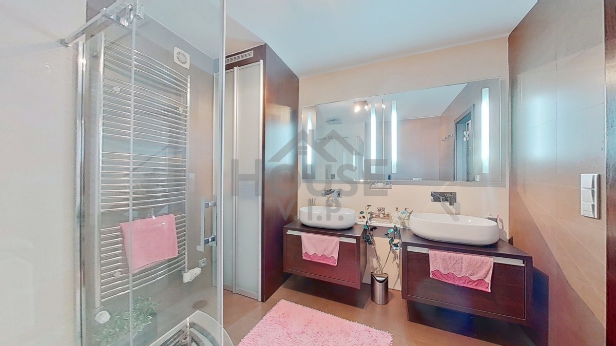 Tento impozantní byt s orientací na V a Z, byl celý navržen. architektem v italském designu. Má vestavěné 2. patro, ve kterém se nachází ložnice a prostorná koupelna s masážní vanou s osvětlením a toaletou. Prvnímu patru dominuje velký obývací pokoj s designovým schodištěm v kombinaci dřevo/kov a s moderním kuchyňským koutem s veškerými zabudovaným elektrospotřebiči. Obytná část je oddělena osvětleným pultem s kamennou deskou (Technistone). Z obývacího pokoje se vstupuje do dalšího pokoje s rozsáhlou skříňovou sestavou; další koženou sedačkou, relaxačním koutem a vstupem na terasu. Ve spodním patře se dále nachází druhá prostorná koupelna se sprchovým koutem, dvěma umyvadly a pračkou. Je zde rovněž samostatné sociální zařízení WC s malým rohovým umyvadlem.