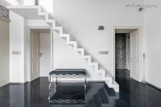 Byt poskytuje dostatek úložných prostor, kontrast dokonale provedených sádrových omítek a režného zdiva, kamenné a dřevěné podlahy, skleněné mozaiky atp.