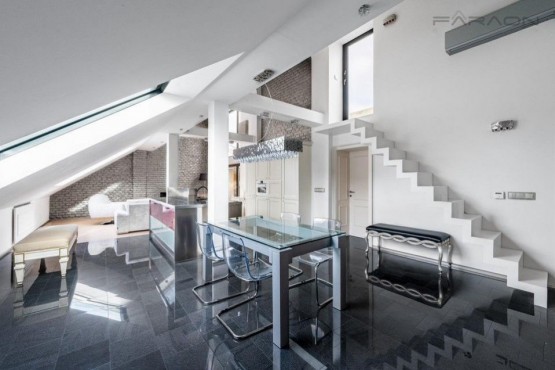 Dispozici bytu tvoří zádveří se samostatnou toaletou, mimořádně prostorný světlý obývacího pokoj s plně vybavenou kuchyní, jídelnou a relaxační zónou s posezením a balkonem orientovaným do klidného vnitrobloku, hlavní ložnice s koupelnou a pracovna. Z obývacího pokoje se dostanete pomocí designového schodiště na střešní terasu poskytující absolutní soukromí.