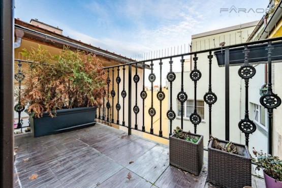 Prodej podkrovního klimatizovaného bytu 3+kk (115 m2) se střešní terasou (35 m2), balkonem (5, 3 m2), sklepem a panoramatickým výhledem, v pos...ledním patře historického nárožního domu Praha 1.
