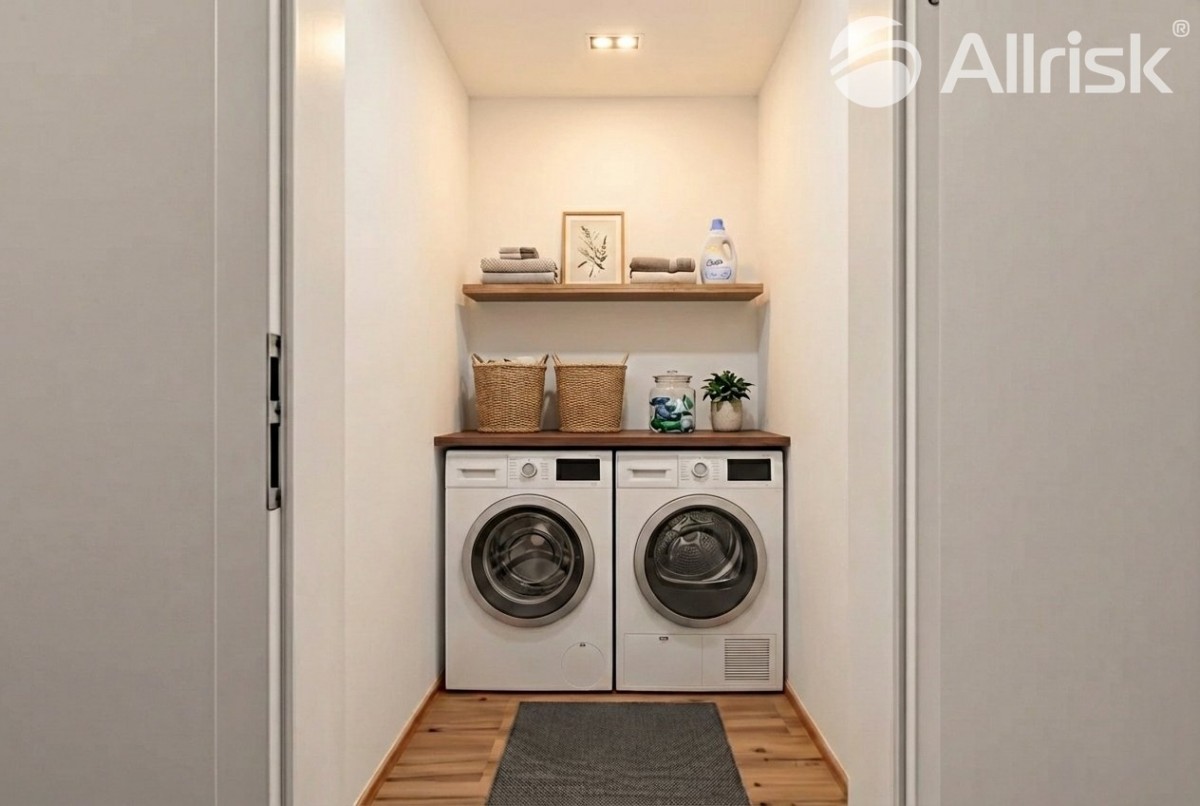 Dispozice bytu zahrnuje zádveří s možností úložných řešení, koupelnu se sprchovým koutem, samostatné sociální zařízení WC, oddělená místnost pro pračku a hlavní obytnou místnost s kuchyňským koutem, ložnici a další pokoj.