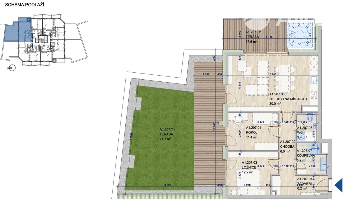 V rámci projektu nabízíme byt 3+kk o celkové ploše 77, 2 m², umístěný ve 2. nadzemním podlaží. Součástí bytu je terasa a zahrada o celkové výměře 72 m², která je přístupná z hlavní obytné místnosti i z ložnice a dalšího pokoje.