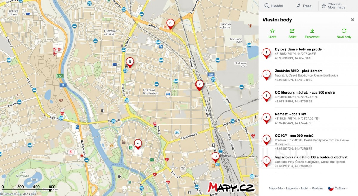 Přímo před domem máte v obou směrech zastávky MHD (linky 5 a 12). Pouhých 800 až 1. 000 metrů to máte do obchodních center IGY i Mercury, na vlakové/autobusové nádraží i na Náměstí Přemysla Otakara II. Uvítáte i blízkost výpadovky na dálnici D3 a budoucí obchvat města.