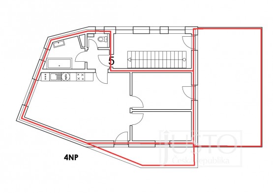 Byt s označením 05 a orientací oken sev...er/západ/jih je součástí projektu výstavby čtyřpodlažního zděného bytového domu o celkem 5 bytech a nachází se ve 4. nadzemním podlaží a je na patře jediný.