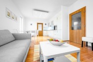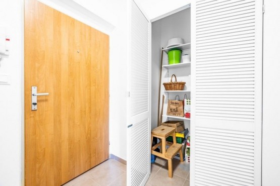 Dispozice světlého bytu 3kk zahrnuje vstupní předsíň s šatním prostorem/komorou, otevřený koncept obývacího pokoje s jídelnou a kuchyní v bílém designu a přímým vstupem na prostorný balkon s orientací na jihovýchod, koupelna se sprchovým koutem a s bidetem, toaleta, menší dětský pokoj, ložnice s orientací do klidné, jižní části.
