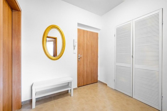 Dispozice světlého bytu 3kk zahrnuje vstupní předsíň s šatním prostorem/komorou, větší otevřený koncept obývacího pokoje s jídelnou a kuchyní v bílém designu a přímým vstupem na prostorný balkon s orientací na jihovýchod, koupelna se sprchovým koutem a s bidetem, toaleta, menší dětský pokoj, ložnice s orientací do klidné, jižní části.