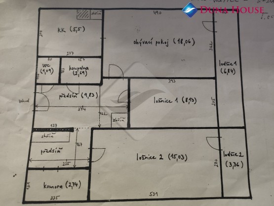 Byt je po celkové, velice zdařilé rekonstrukci (plastová okna, nová elektroinstalace, podlahy, vyzděné bytové jádro apod. ). Dispozice bytu: obývací pokoj s kuchyňským koutem (23, 56 m2) se vstupem na lodžii (6, 84 m2), pokoj (15, 03m2) se vstupem na menší lodžii (3, 36 m2), pokoj (8, 13 m2), prostorná chodba s dvěma vestavěnými skříněmi (9, 86 m2), koupelna (2, 69 m2), samostatné sociální zařízení WC (1, 09 m2) a komora (2, 74 m2). Dále k bytu patří sklepní kóje (1, 5 m2).