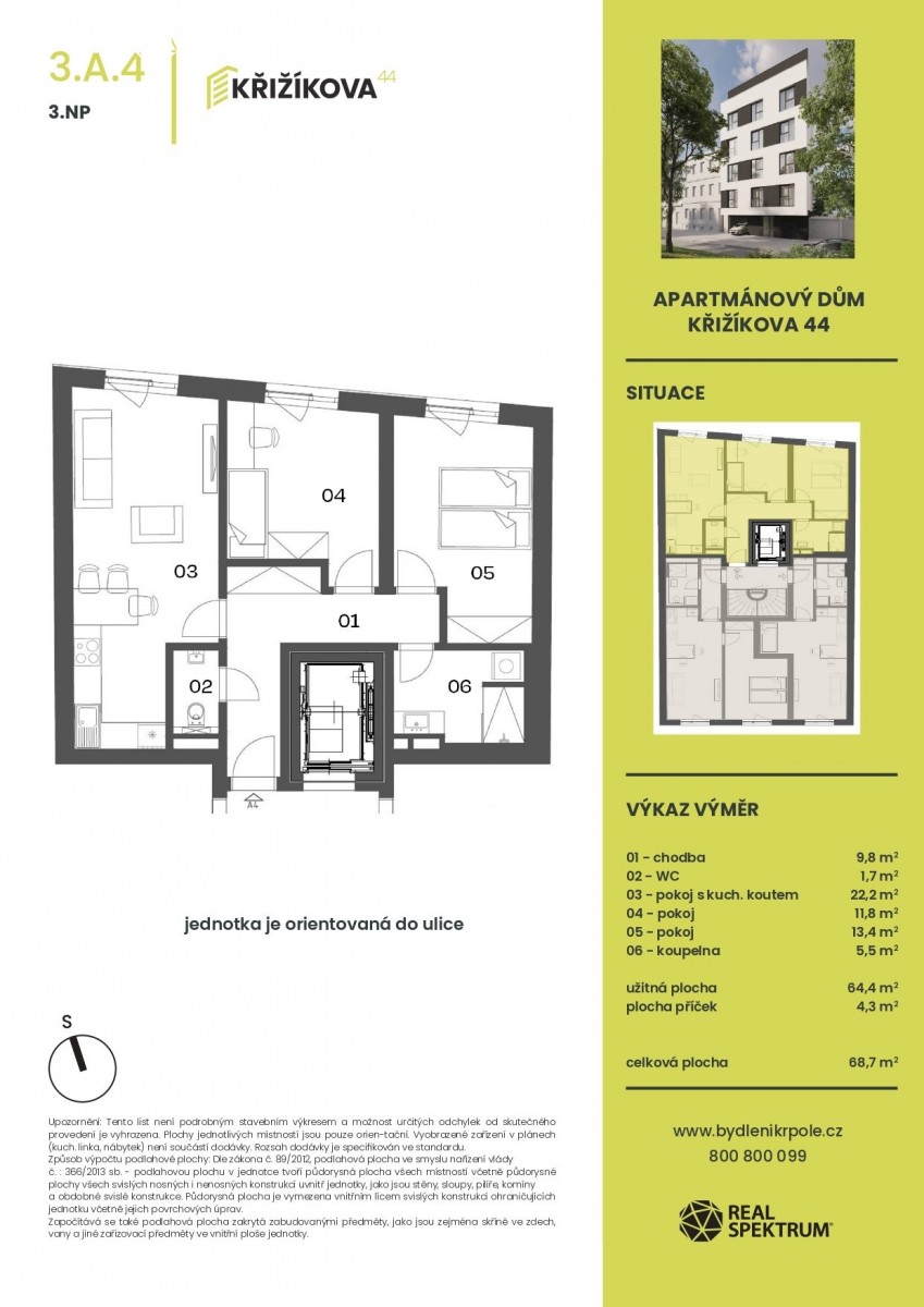 chodba (9, 8 m²), obývací pokoj s kuchyňským koutem (22, 8 m²), pokoj (13, 4 m²), pokoj (11, 8 m²), koupelna (5, 5 m²), sociální zařízení WC (1, 7 m²), sklep