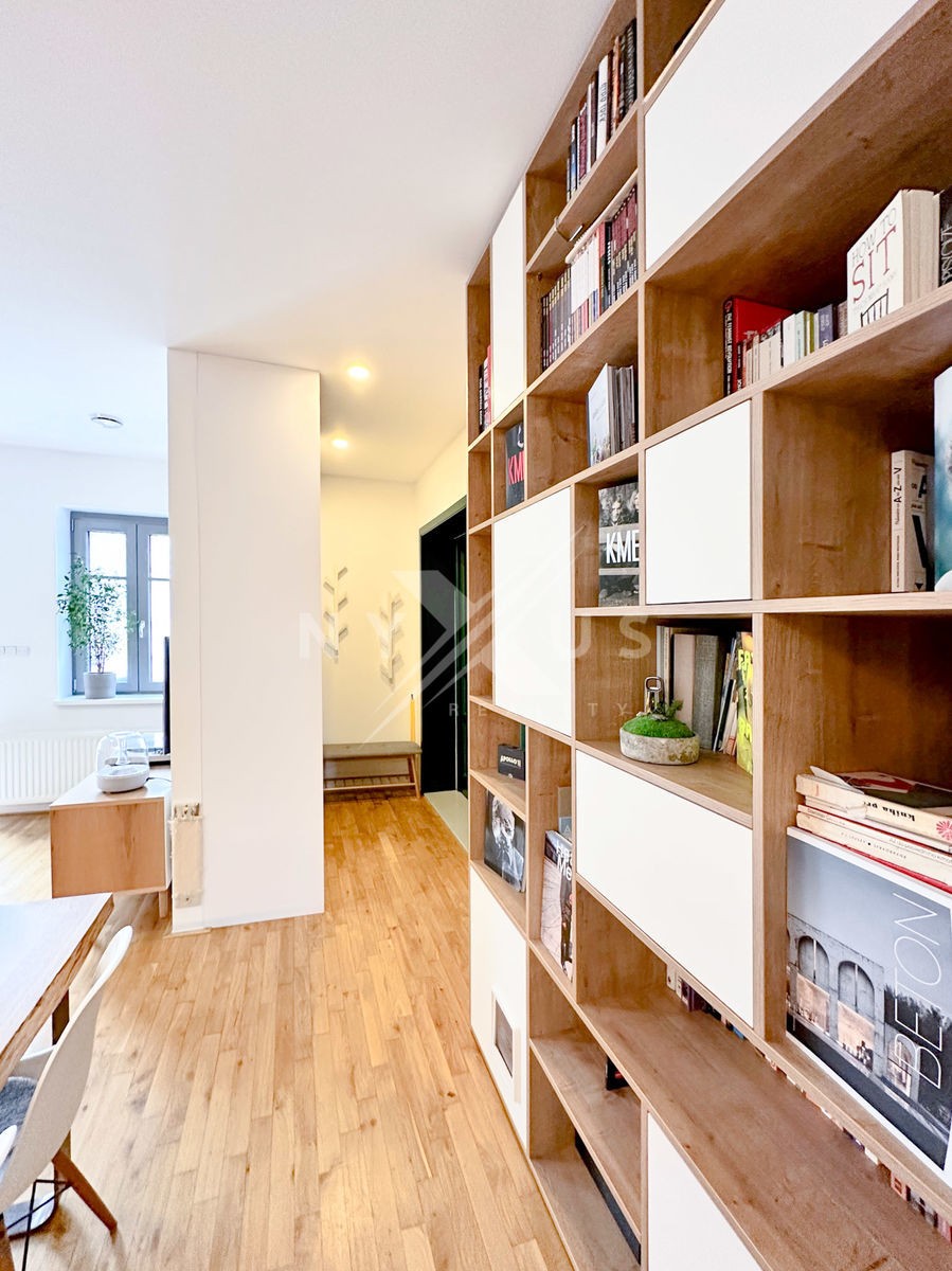 Jednotka sestává z chodby, koupelny, dětského pokoje, ložnice a velice prostorného obývacího pokoje s kuchyňským koutem. V ložnici najdete vestavěnou skříň s velkým úložným prostorem a na chodbě na míru vyrobenou knihovnu.