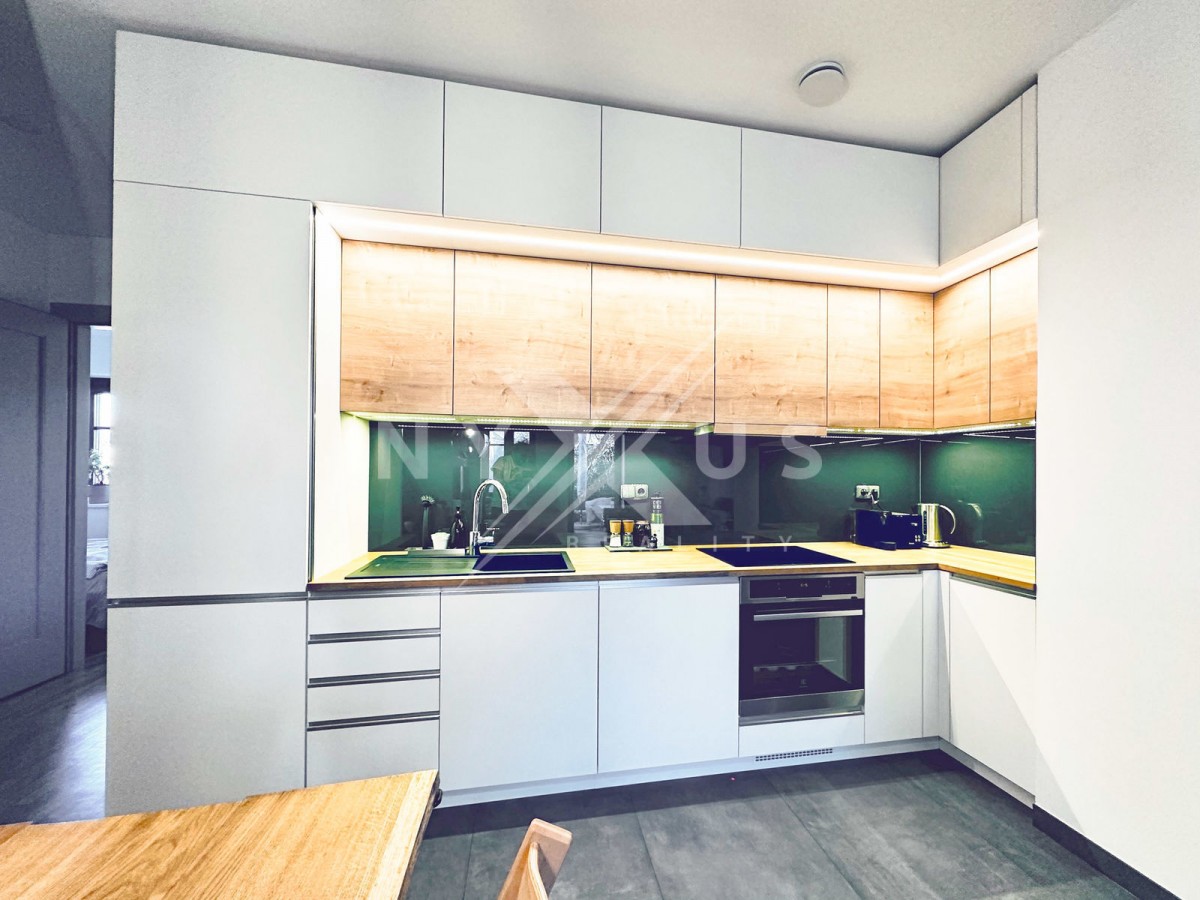 Kuchyň disponuje moderními spotřebiči a dostatkem úložného prostoru. Z obývacího pokoje vede vstup na terasu.