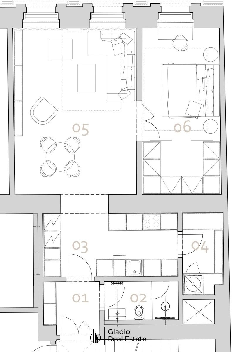 byt zahrnuje obývací pokoj s kuchyňskou linkou s východem do chodby. Chodba spojuje obývací pokoj s ložnicí a vstupní halou, koupelnu se sprchovým koutem a toaletou. Byt má vlastní pavlač (terasu) se vstupem do komory s vlastním oknem.