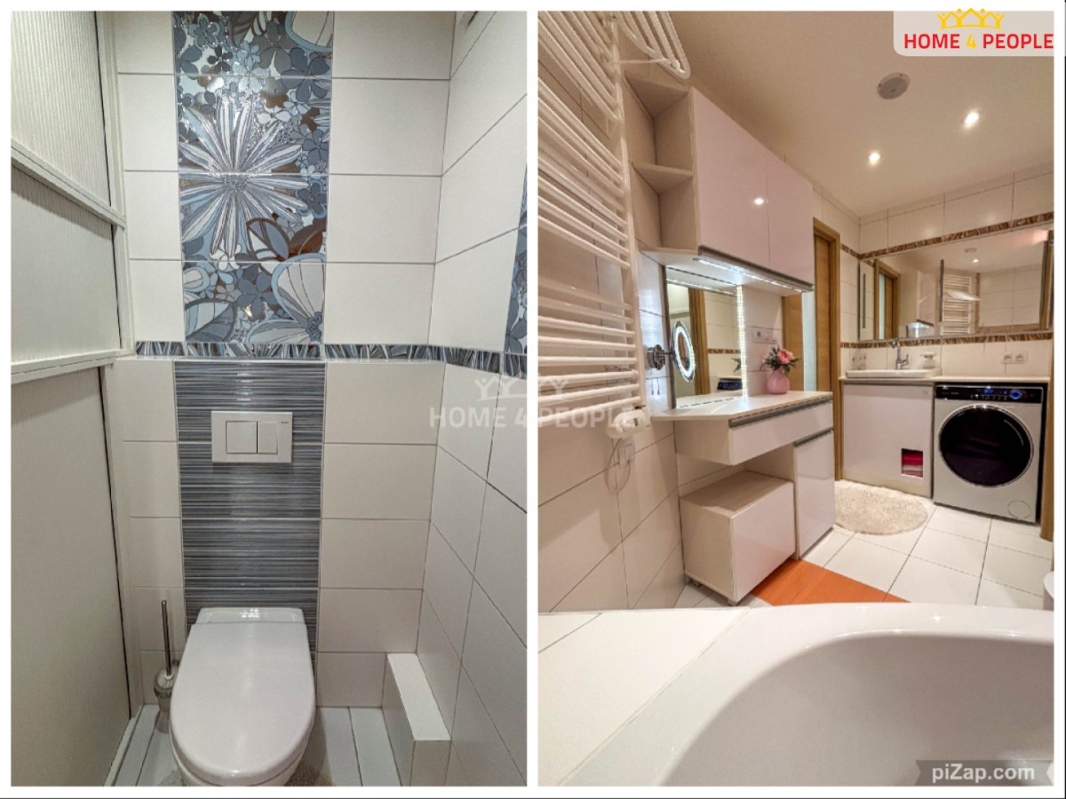 • Koupelna (5, 3 m²) vybavená vanou, pračkou a kosmetickým stolem. Toaleta (1, 4 m²)