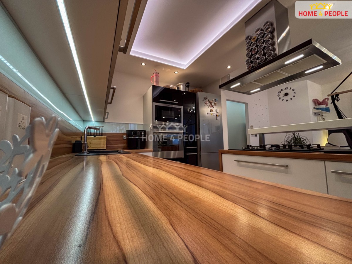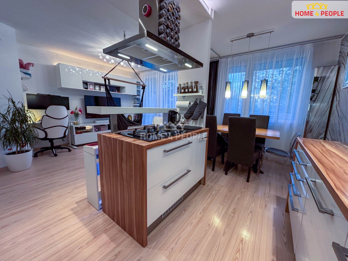 moderní kuchyňskou linkou s ostrůvkem, plynovou sklokeramickou deskou a všemi