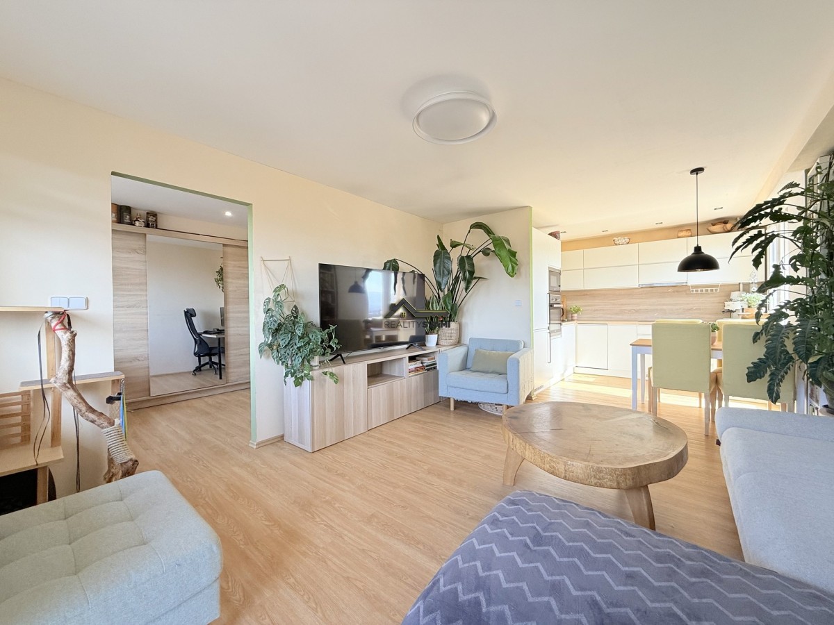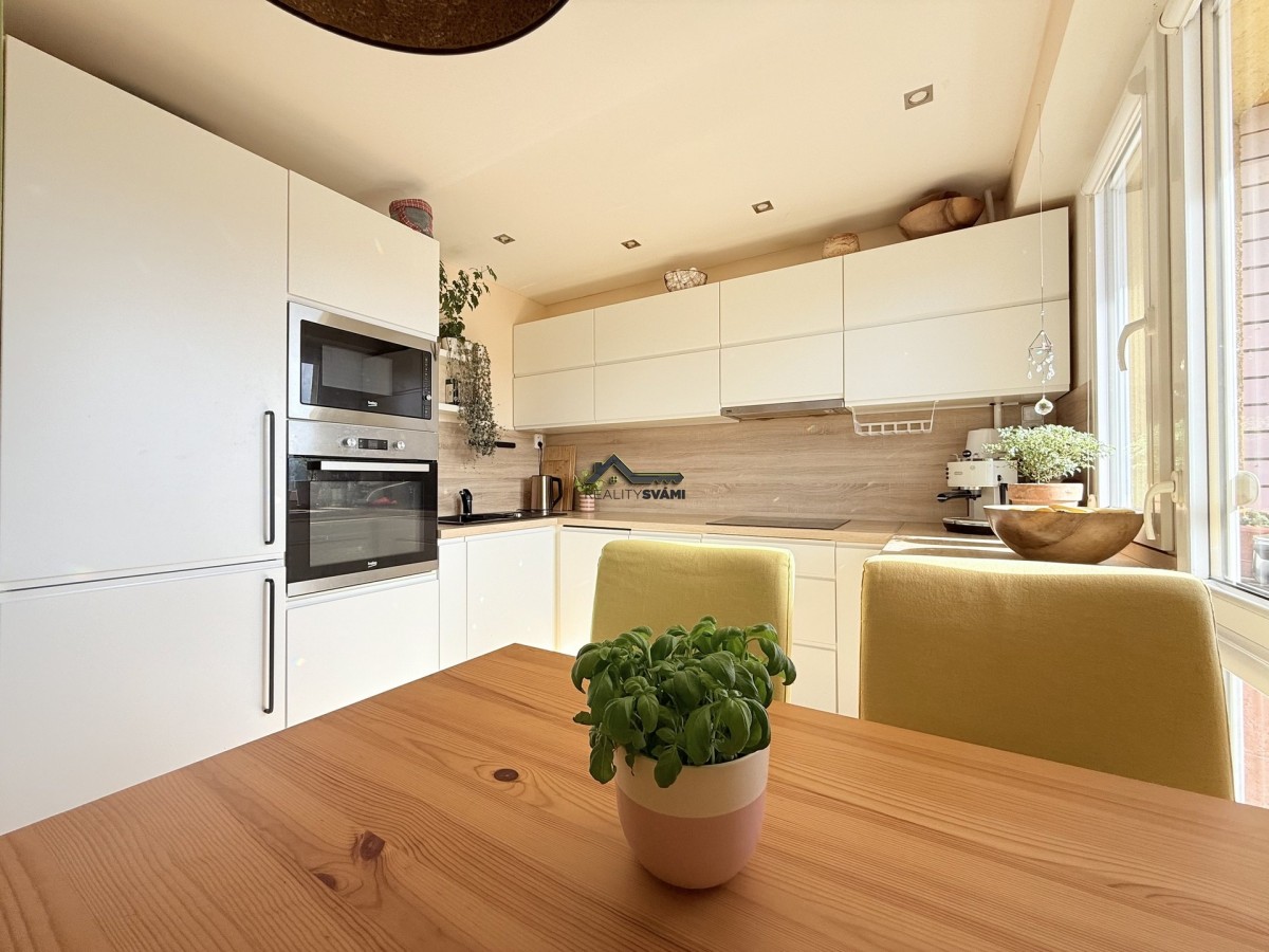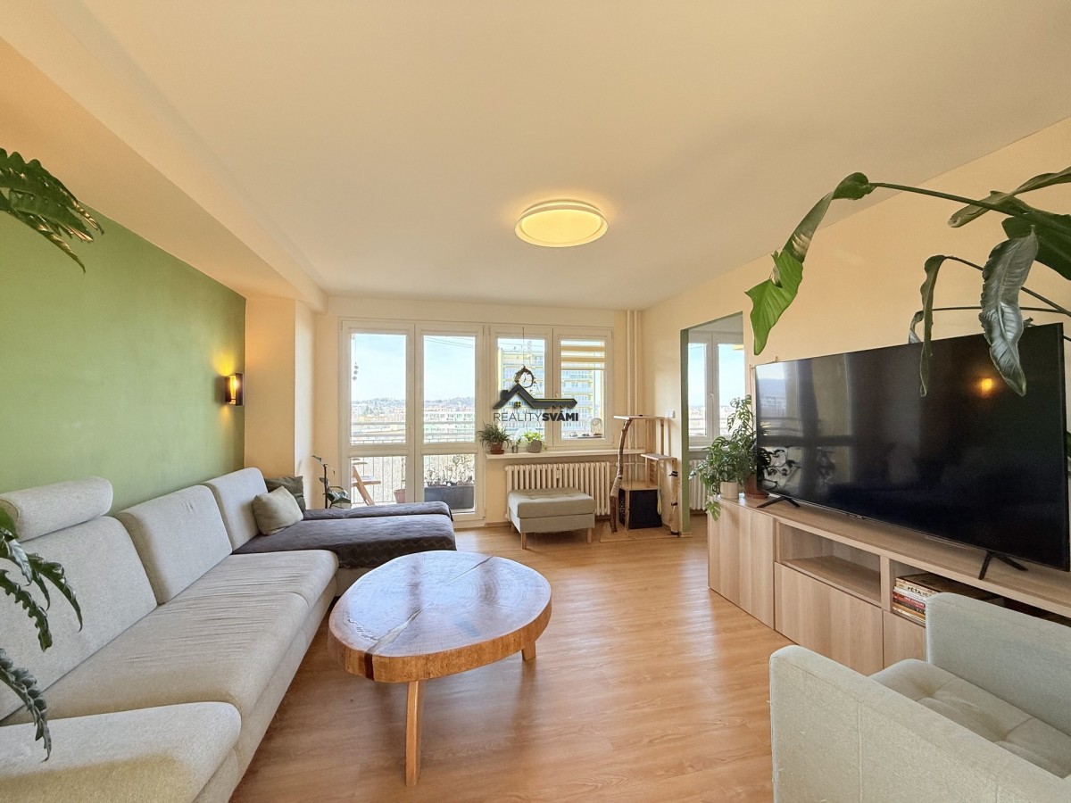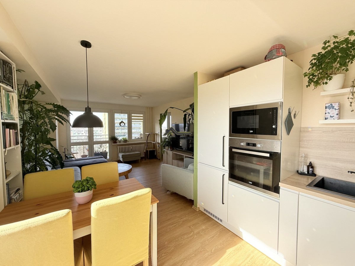 Byt je umístěný v desátém patře panelového d...omu po revitalizaci. Prošel před několika lety kompletní rekonstrukcí, při níž bylo změněn celkový prostor bytu, upraveny příčky, vyzděno bytové jádro. Dveře bytu byly umístěny ve většině případů do pouzder, čímž byl zvětšený obytný prostor. Dále byla měněna kuchyňská linka, která má vestavěné spotřebiče, včetně myčky nádobí. V koupelně nechybí velkorysý prostor sprchového koutu, ale našlo se místo i na pračku, nebo žebříkové topení, které díky elektrickému přívodu můžete používat i v létě. Nezapomnělo se na rozvody elektřiny a vody, plovoucí podlahy s kombinací dlažby na toaletě a v koupelně, snížení stropů, pomocí sádrokartonu v předsíni a nechybí i nové omítky. K bytu jsou 2 balkóny, kdy jeden z nich má téměř 8m2 a také sklepní kóje.