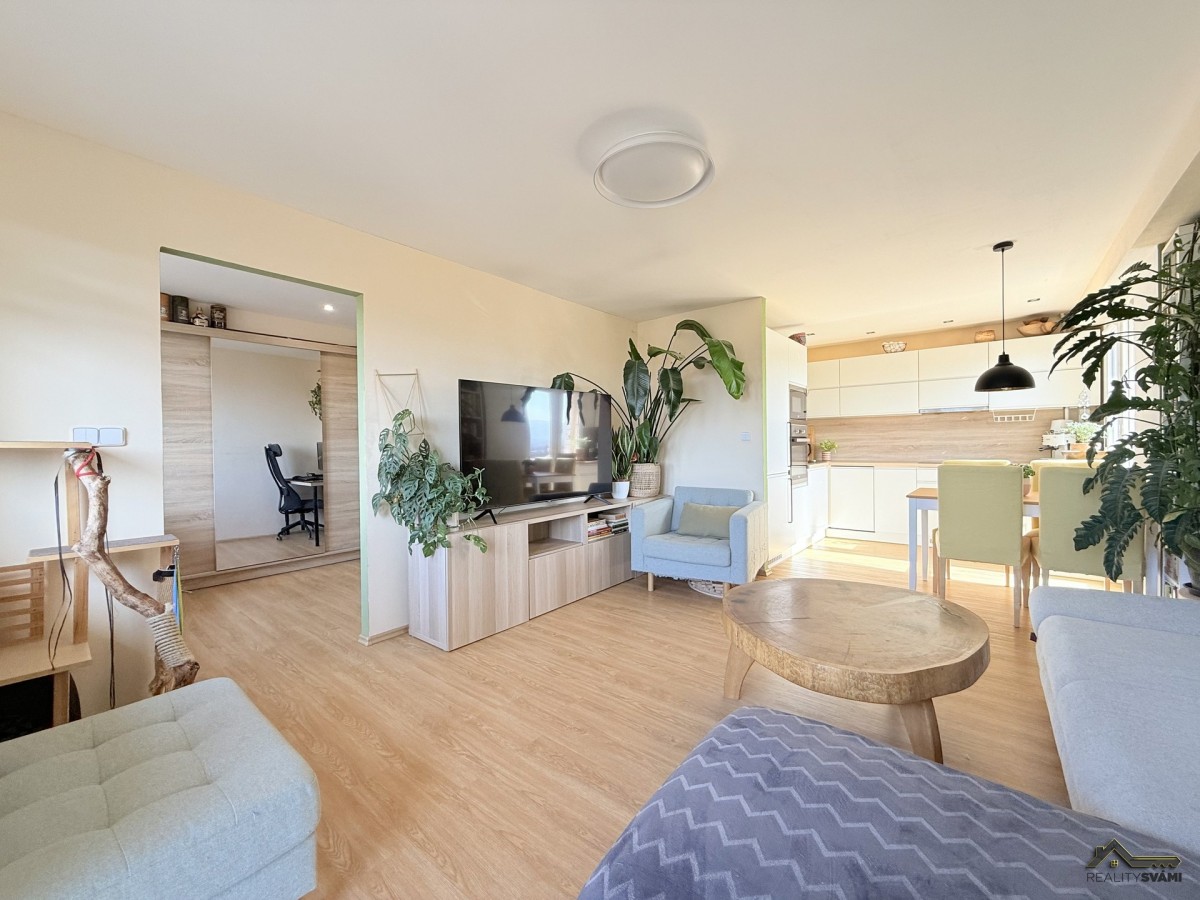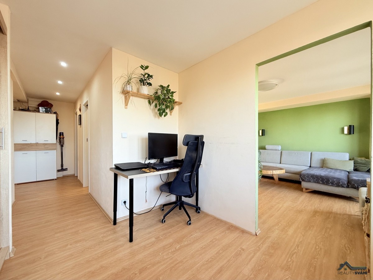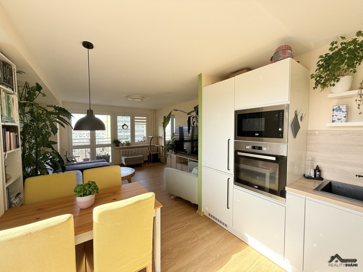 Rozdělení bytu bylo při rekonstrukci změněno..., a to tak, že vznikly 2 samostatné pokoje, jako je ložnice a obývací pokoj, který je navíc spojený s kuchyňským koutem a jeden z pokojů je použitý jako průchozí pracovna. Byt je umístěný v desátém patře panelového domu po revitalizaci. Prošel před několika lety kompletní rekonstrukcí, při níž bylo změněn celkový prostor bytu, upraveny příčky, vyzděno bytové jádro. Dveře bytu byly umístěny ve většině případů do pouzder, čímž byl zvětšený obytný prostor. Dále byla měněna kuchyňská linka, která má vestavěné spotřebiče, včetně myčky nádobí. V koupelně nechybí velkorysý prostor sprchového koutu, ale našlo se místo i na pračku, nebo žebříkové topení, které díky elektrickému přívodu můžete používat i v létě. Nezapomnělo se na rozvody elektřiny a vody, plovoucí podlahy s kombinací dlažby na toaletě a v koupelně, snížení stropů, pomocí sádrokartonu v předsíni a nechybí i nové omítky. K bytu jsou 2 balkóny, kdy jeden z nich má téměř 8m2 a také sklepní kóje.
