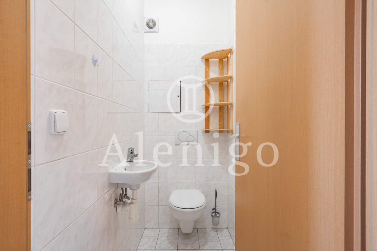 Dům je po renovaci společných prostor. Terasa a obývací pokoj jsou orientovány na jih, z terasy je volný výhled do zeleně (na vlastní pozemek, patřící k bytu). Ložnice a kuchyně jsou orientovány na západ. Kuchyňská linka se sporákem a lednicí. Topení je řešeno vlastním elektrokotlem. V koupelně se nachází vana. Toaleta s vlastním umyvadlem je řešena samostatně. Součástí bytu je také praktická komora v bytě a garážové stání v 1. podzemním podlaží. Měsíční náklady jsou cca 4. 500, - Kč + elektřina.