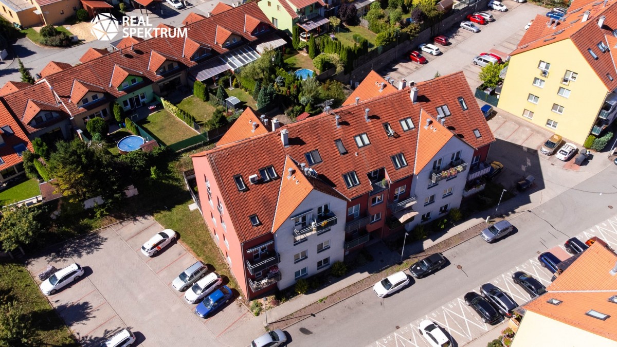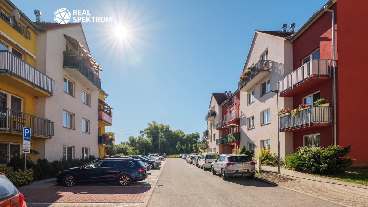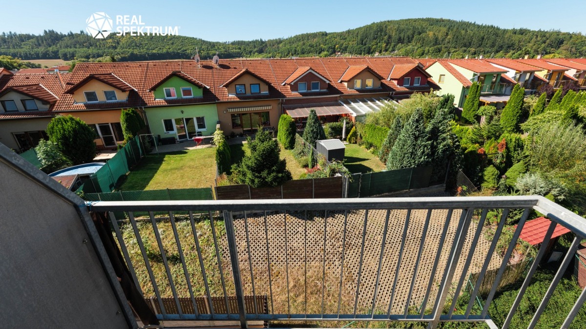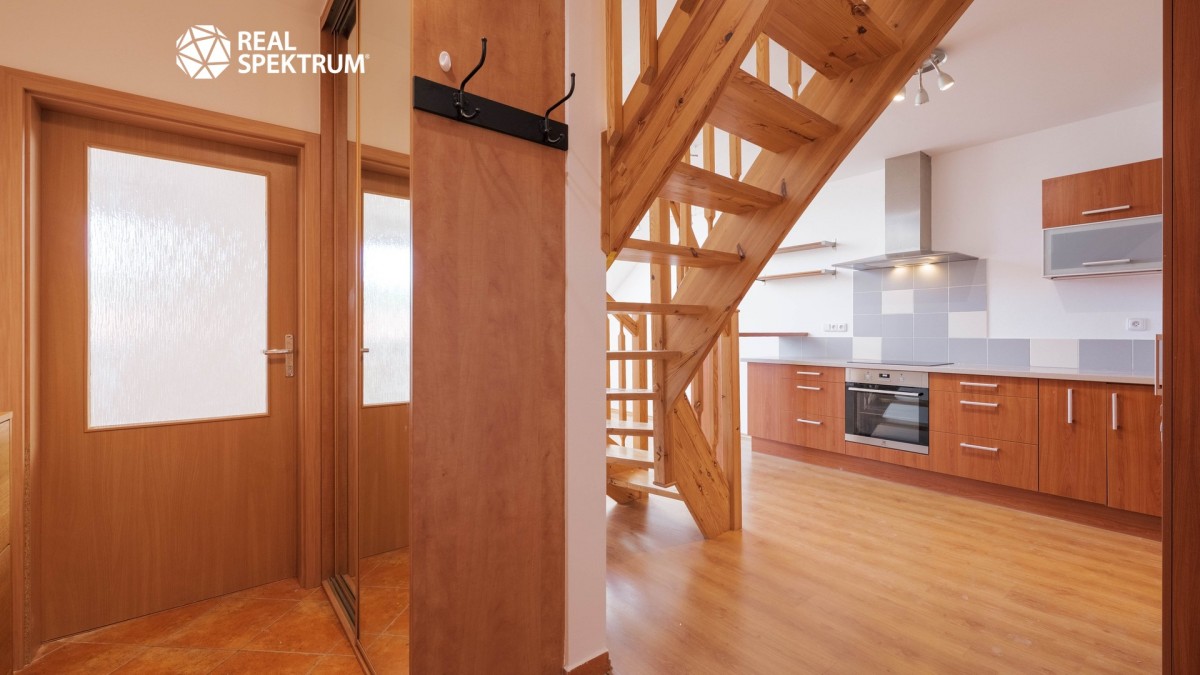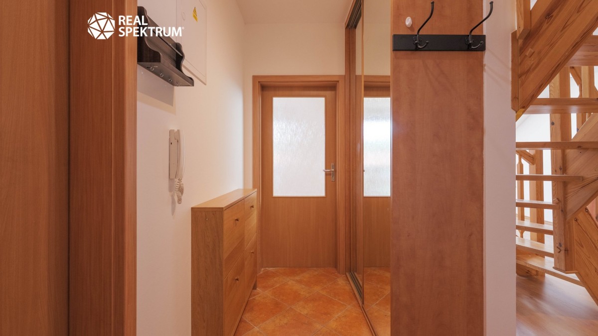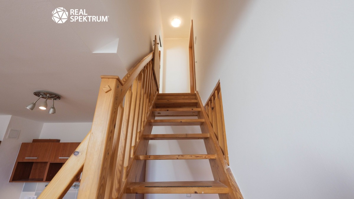 V přízemí bytu vás přivítá prostorný, prosvětlený obývací pokoj s částečně odděleným kuchyňským koutem a přístupem na balkon — ideální pro letní posezení. Dále praktické zádveří s vestavěnou skříní a koupelna s sociální zařízení WC. Po vnitřním schodišti vystoupáte do horního podlaží, kde jsou dvě samostatné ložnice — klidné a útulné místnosti pro odpočinek.