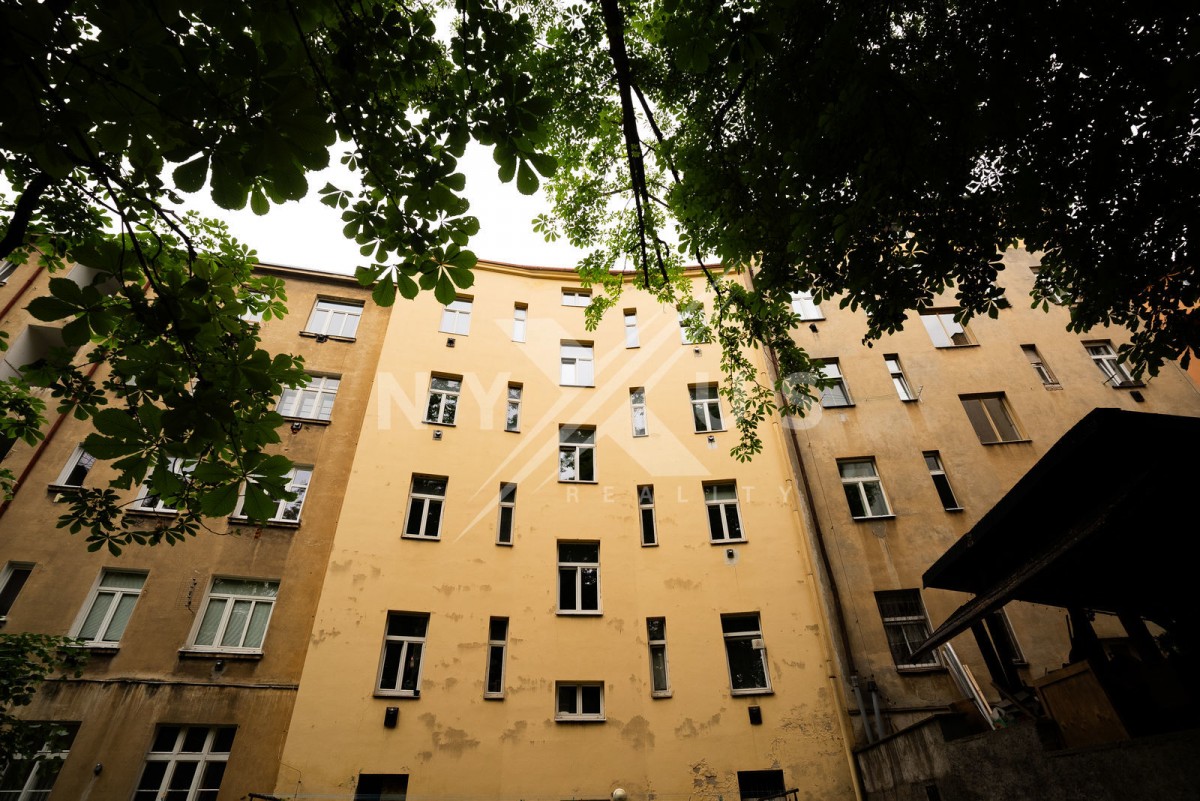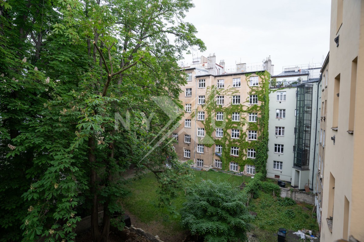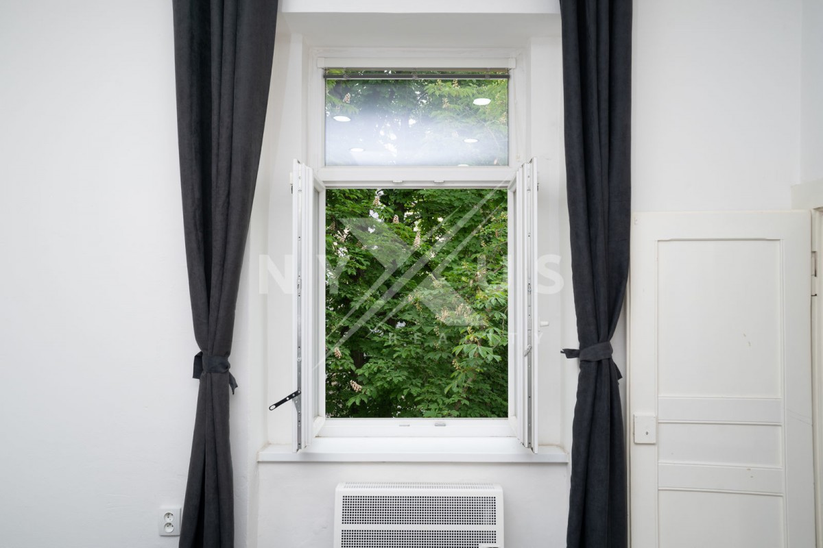 Okna jedné z ložnic vedou do klidného vnitrobloku, v němž se rozkládá velká zahrada přístupná pro obyvatele domu.