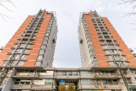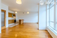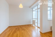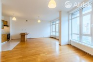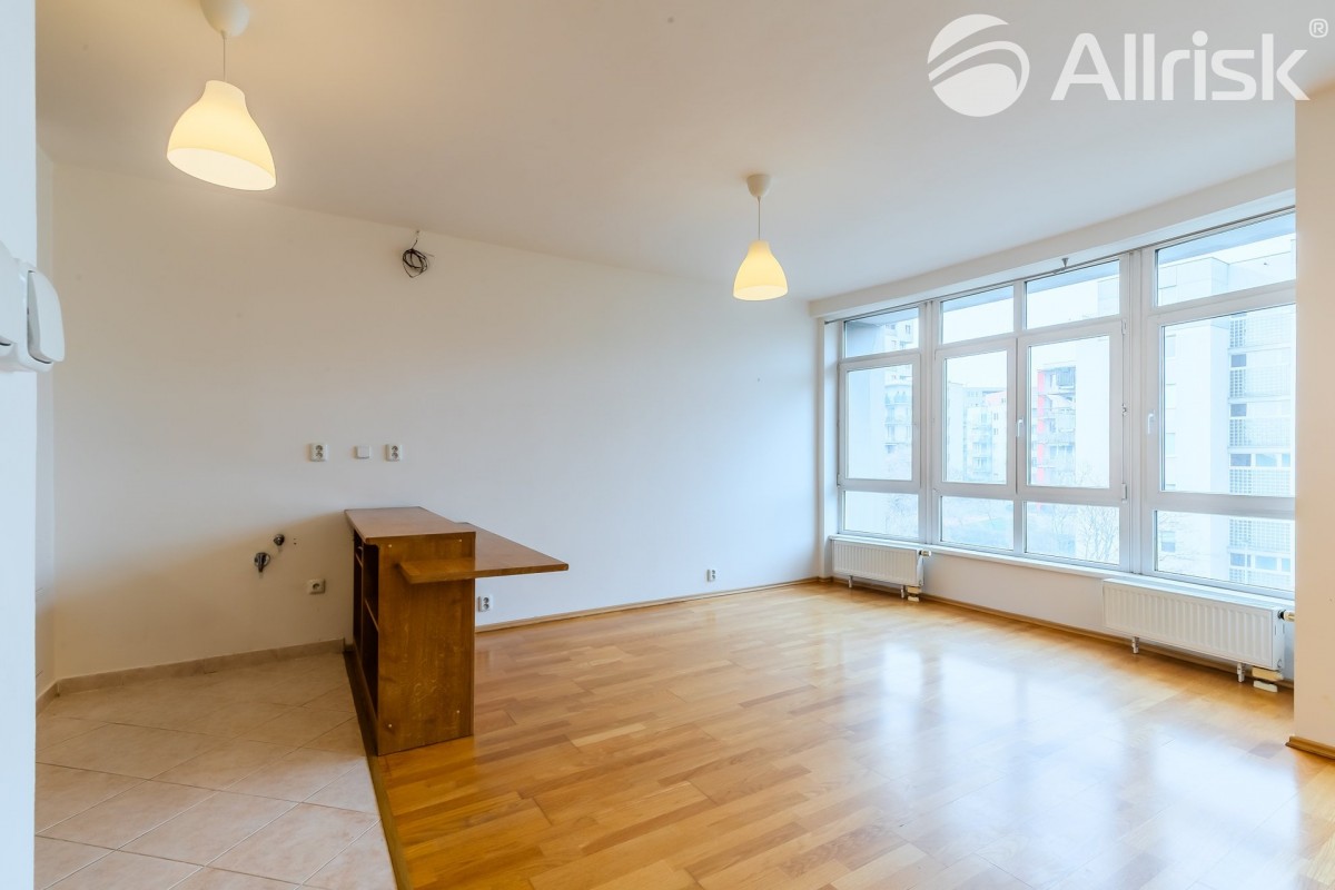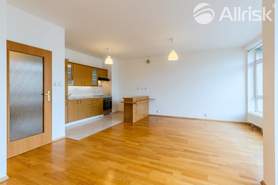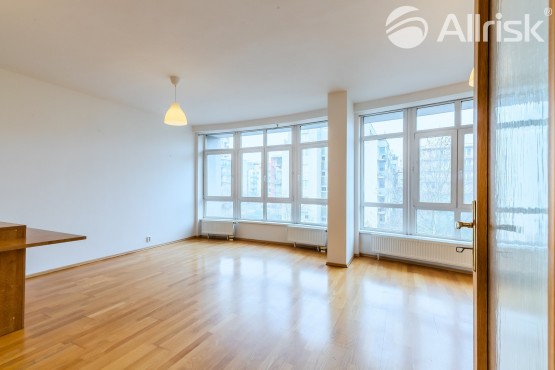 V bytě je moc hezký, prostorný obývací pokoj s téměř celou stěnou prosklenou, tvarem do mírného oblouku, poskytující hezký výhled do parčíku. Obývací pokoj je spojený s kuchyňským koutem.